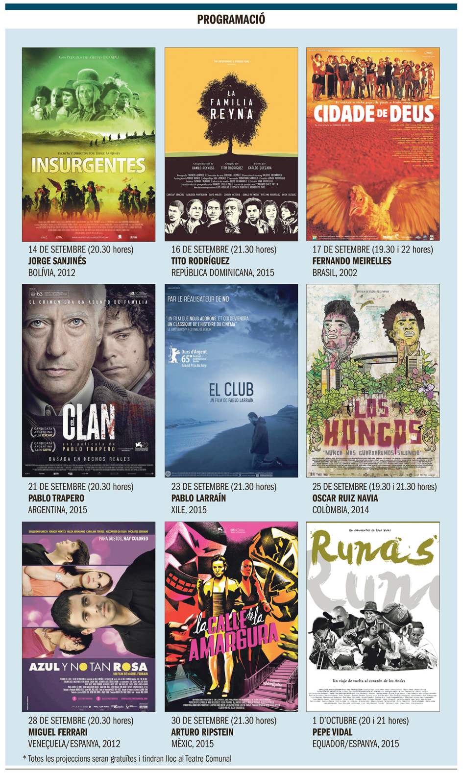 Doncs ja la tenim aquí: la primera edició del Cicle de cine iberoamericà, organitzat pel Cineclub de les Valls i una de les propostes més atractives del cartell de la capitalitat iberoamericana de la cultura. I es diu ràpid, perquè ja s’ha programat prop d’un centenar i mig d’activitats. Seran dotze pel·lícules que es projectaran des d’avui mateix fins a l’1 d’octubre al Teatre Comunal –una marató de 21 dies de cine, amb quatre títols setmanals– i que ofereixen una estupenda perspectiva d’un cine que rarament, per no dir mai, arriba a les pantalles comercials, amb l’honrosa excepció del Cineclub: que aixequi el dit qui hagi vist mai una pel·lícula boliviana. O equatoriana. O dominicana. Doncs ara és l’hora, perquè pel Comunal hi desfilaran projeccions d’una dotzena de títols que toquen tots els gèneres i temes, amb especial atenció a la lluita per la supervivència als barris marginals (Cidade de Deus), la crònica negra (La calle de la amargura), el retrat de les grans megalòpolis del continent (Runas) i la crítica del colonialisme (Insurgentes, El abrazo de la serpiente), amb lloc també per a les preocupacions de l’home contemporani –l’homofòbia i la identitat sexual, a Azul y no tan rosa– i una tirada especial pel documental: a Cidade de Deus la seguirà la projecció d’una pel·lícula que segueix, deu anys després, el periple dels actors no professionals que van protagonitzar la cinta de Meirelles. Serà una de les tres sessions dobles previstes: Colòmbia també repeteix, amb Los hongos i El abrazo de la serpiente, i l’Equador també, amb La ventana de los Andes i Runas, on el director Pepe Vidal retrata el formigueig humà de la Plaza de los Ponchos, el mercat artesanal més gran de l’Amèrica Llatina, a la ciutat equatoriana d’Otavalo. Això serà a l’última jornada del cicle, amb cinefòrum i presència del realitzador. Totes són, en fi, pel·lícules de producció recent, i moltes, premiades en festivals internacionals (l’argentina El clan es va endur un Lleó de Plata a Berlín, la xilena El club, un Globus d’Or, Azul no tan rosa, un Goya, i La calle de la amargura, a Gijón). Les bones notícies no s’acaben aquí: és molt probable que el 2017 hi hagi una segona edició del cicle, però és que, a més, immediatament després començarà la temporada del Cineclub i les Jornades de cine espanyol, aquest curs amb convidat d’excepció: Juanma Bajo Ulloa, que assistirà a la projecció d’Alas de mariposa.