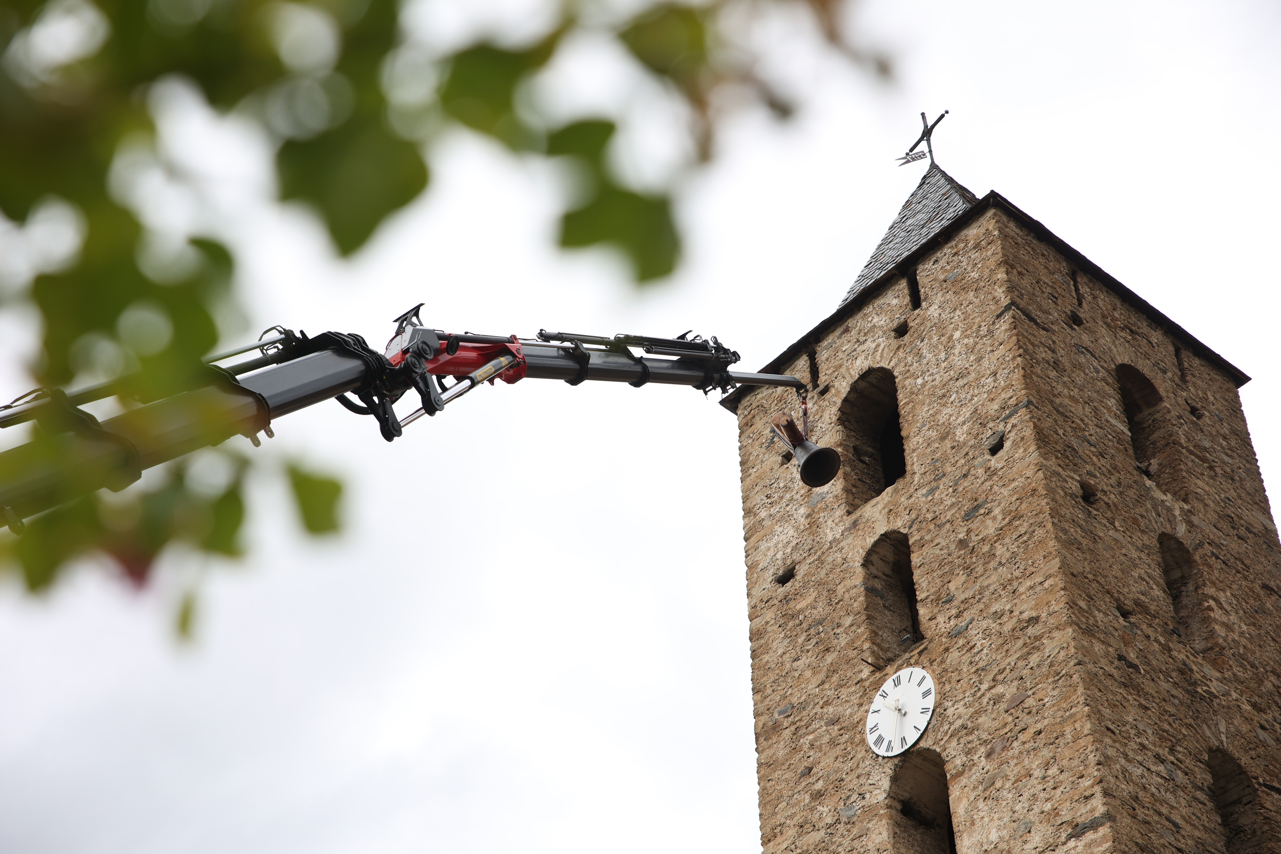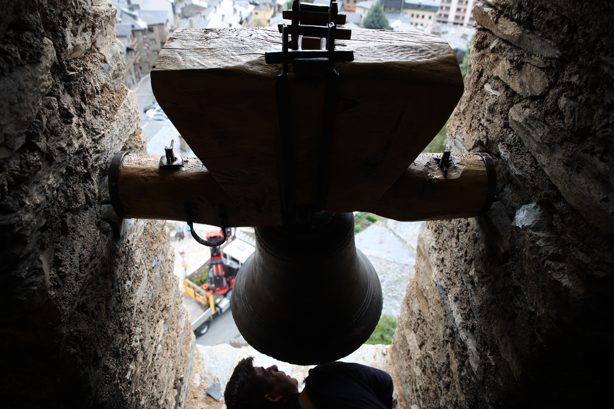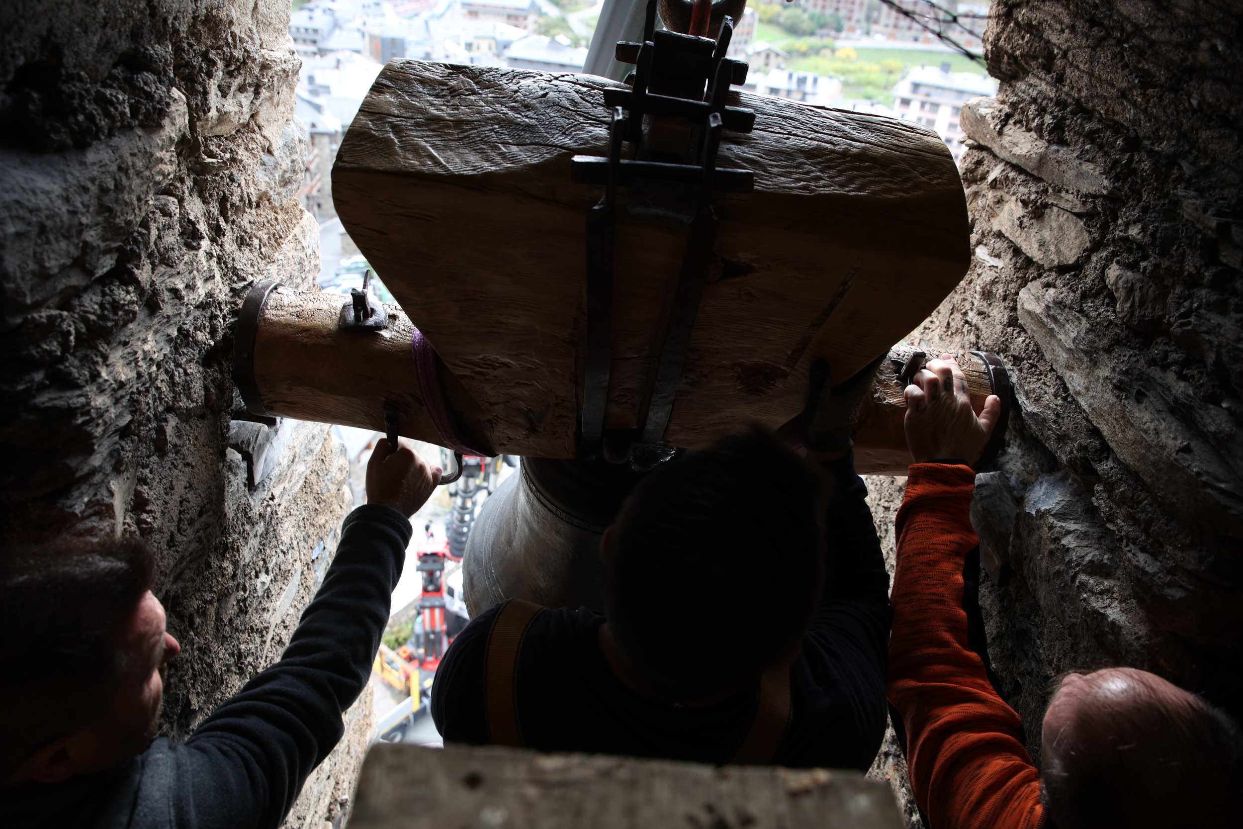 A la segona. La Bàrbara va entrar a la segona. A la primera no hi va haver manera: la sirga amb què l’havia aixecat com si fos un pes ploma per pujar-la al tercer i últim pis de Sant Serni –el campanar més alt entre els andosins, amb els seus 33 metres– era massa llarga i no permetia fer el joc necessari per entrar-la de costat per la finestra, encaixar-la als rodaments de fusta i clavar-la a les pollegueres. Impossible. Amb diferència, el moment més delicat de l’operació, perquè cal una coordinació extrema entre el gruista i el mestre campaner, enfilat al forat de la finestra i lligat amb un arnès de seguretat mentre manipula la campana. Va de mil·límetres, i a la primera no se’n surten. Així que la Bàrbara, 118 quilets de bronze i estany, i el jou de fusta massissa, en deu fer un centenar més, tornen a baix.