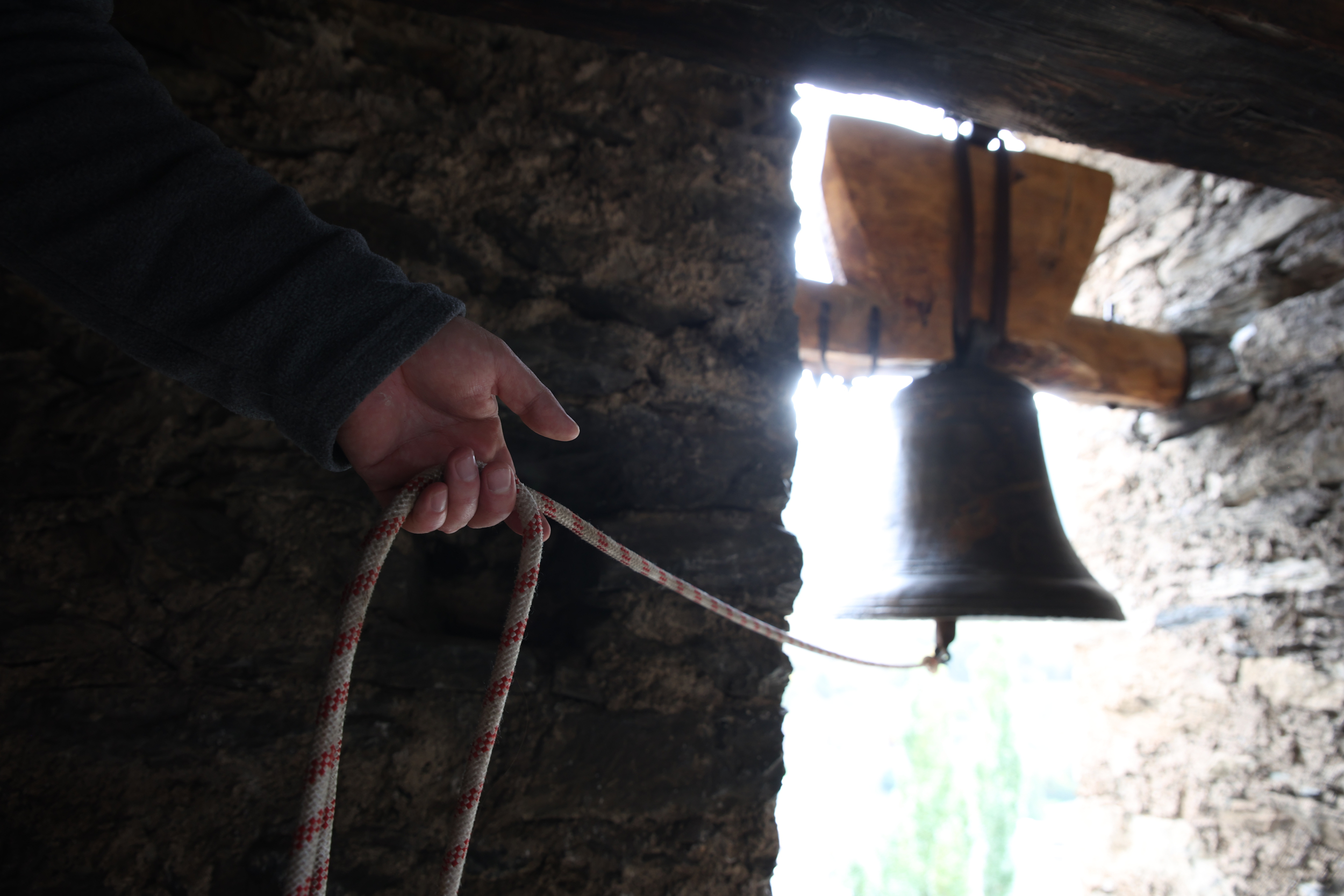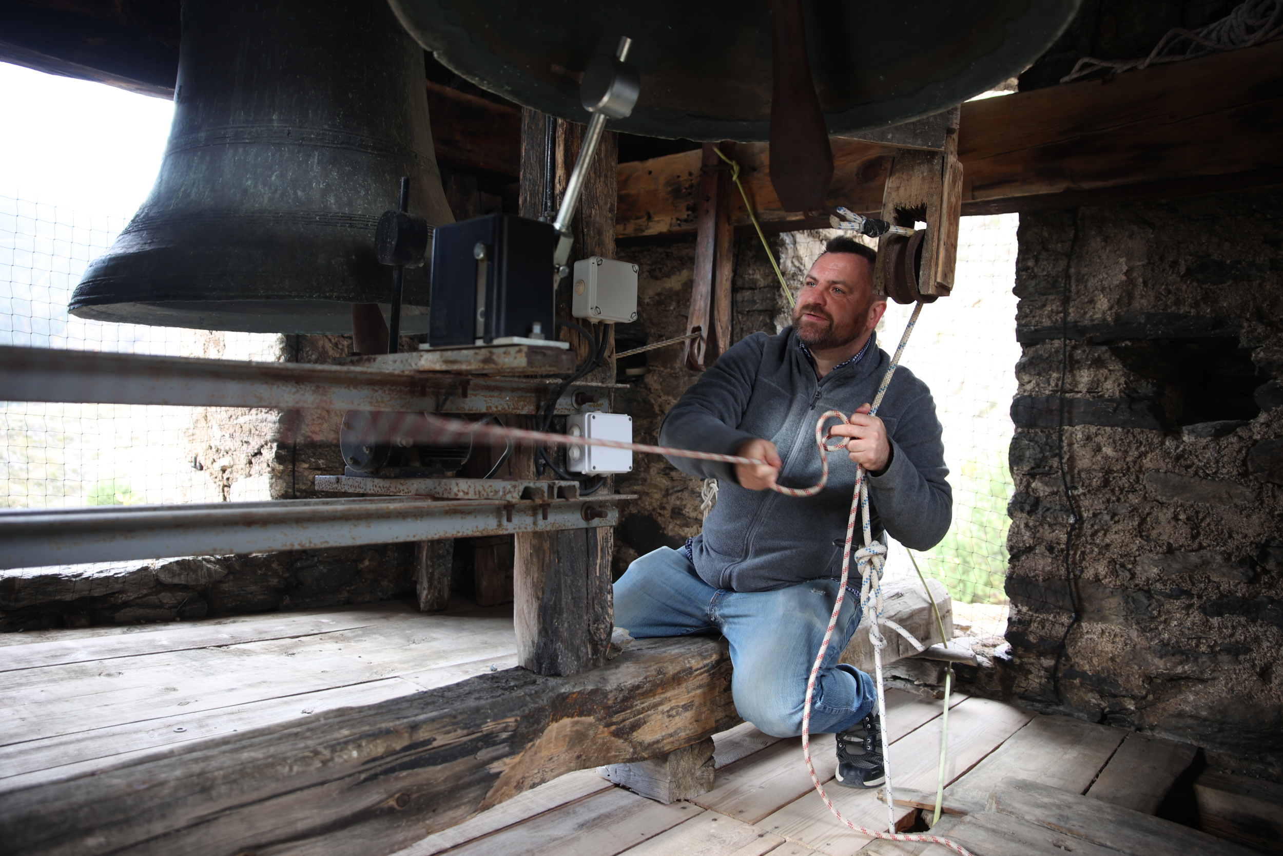 Com que caldrà esperar dos dies, dos, que el morter agafi, i el Robert no té espera, abans que l’operari s’hi posi agafa les regnes de la Maria, de la Saturnina i naturalment de la Bàrbara i es marca un repic d’exhibició. Primer, la Bàrbara sola, de benvinguda; després, totes tres, el de festa major. I us puc assegurar, perquè hi era, que sentir repicar a un pam del cap una campana de quasi mil quilos –la Saturnina, gens casualment dita la Grossa, va ser fosa el 1618 i pesa 770 quilos– produeix un efecte efervescent, vigoritzant i per què no dir-ho, euforitzant, com quan condueixes de nit per la collada de Tosses, ni una ànima a la vista, amb les finestres del cotxe obertes i la música a tot volum. És un moment emocionant, que ens connecta d’una manera misteriosa però indiscutible amb Jacquetti i els que fa dos segles el devien ajudar a hissar la Bàrbara com nosaltres hem ajudat –o més aviat, fet nosa– al meu amic Francisco. Com Jacquetti, que si va fer com els fonedors de tota la vida es va fer lligar a la campana mentre era hissada per garantir amb la seva vida que arribaria al destí, Francisco ha supervisat des de primeríssima fila tota l’operació, i sospito que no s’ha lligat a la Bàrbara no per falta de ganes, sinó per no muntar un sidral.