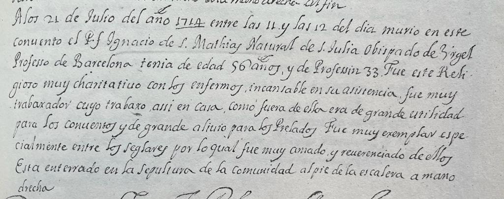 El final és pelet tètric –aquest “a mano derecha”– però ens dona una idea de qui va ser Ignasi de S. Mathias. Del que no sabem res és del que va passar entre el 17181, l’any que va professar, i el 1714, l’any que va traspassar. Gras espera poder-ne escatir algun detall biogràfic més a partir dels registres de conventualitat, que podrien aportar una mica de llum sobre els motius que van portar-lo a fer-se religiós, i precisament a l’orde dels Carmelites descalços.