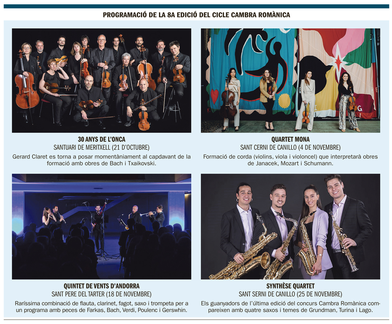 Els altres plats fort del programa són el Quartet Mona, dos violins, viola i violoncel, amb peces a Janacek, Mozart i Schumann (Sant Serni de Canillo, 4 de novembre), el Quintet de vent, raríssima formació sorgida de l’ONCA que combina flauta, clarinet, fagot, saxo i trompeta, que es va poder veure a l’estiu a Casa de la Vall i que desfilarà el 18 de novembre per Sant Pere del Tarter, i Synthèse Quartet, guanyadors de l’última edició del concurs Cambra Romànica (Sant Serni de Canillo, 25 de novembre).