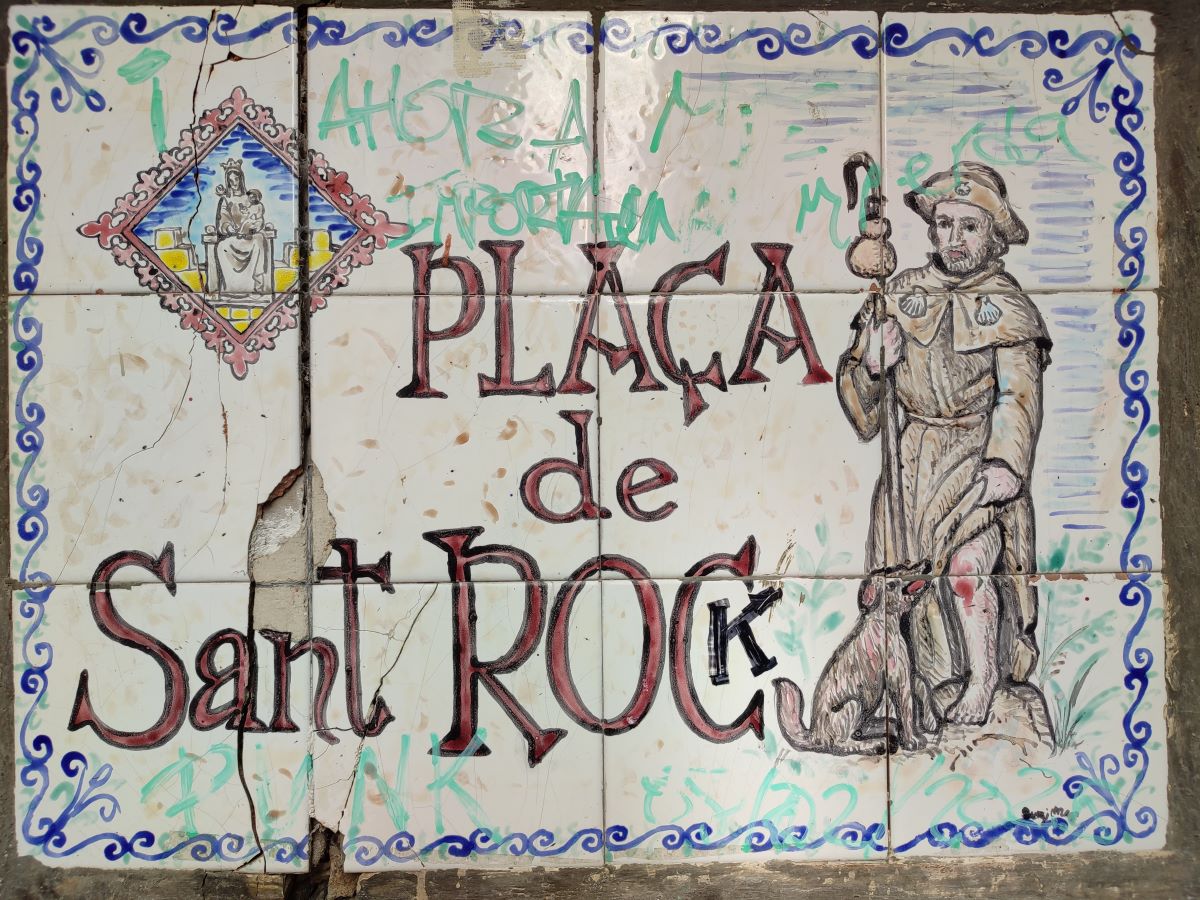 Voldria pensar que avui a ningú no se li acudiria fer una pintada com aquesta al mur de la catedral, per molt AC/DC que sigui, perquè compto que més o menys tothom sap que la catedral és un monument de gran valor patrimonial on aquestes coses no s’han de fer (tot i que escrivint això toco fusta). A dia d’avui, però, no gaire lluny del lloc dels fets, trobem una altra bretolada amb afectacions patrimonials, de missatge similar, però sobre un element que passa molt més desapercebut que la catedral. Es troba a la placeta de Sant Roc, a mitja alçada del carrer dels Canonges, i és una placa feta de rajoles vidriades que recull, amb colors virolats, la denominació de la plaça i una imatge del sant, de cert regust medieval. Al nom del sant titular, protector dels empestats, algú hi ha afegit una lletra K que rebateja l’espai com a plaça de Sant Rock. Si no fos que uns quaranta anys separen les dues bretolades, podríem pensar que els empastifadors són membres d’una cèl·lula radical que reivindica una música més sincopada i més internacional que la de l’acordió diatònic, però aquí s’acabaria el seu rastre. I mentre no apareguin més pintades es farà molt difícil parlar d’una campanya orquestrada.
