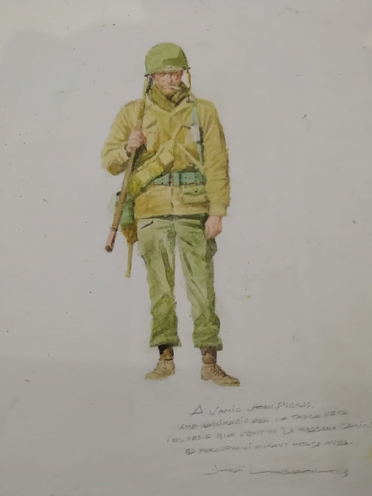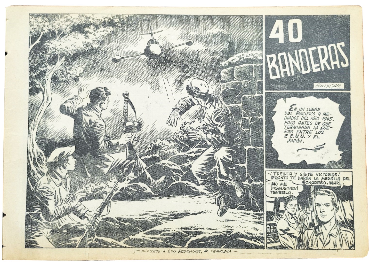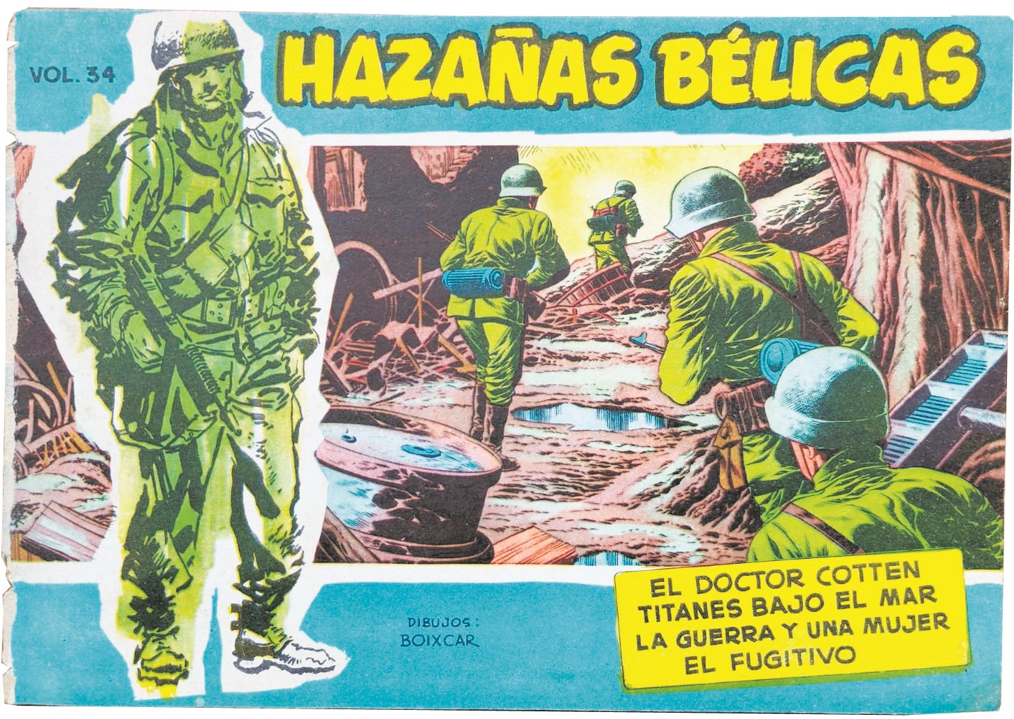 Són sis quadernets, deia, de la sèrie blava i que recullen tres aventures de títols formidables –El doctor Cotten, Titanes bajo el mar, La guerra y una mujer. L’editorial Toray volia esprémer així l’èxit de la sèrie, que havia començat a publicar el 1948, que va passar inicialment sense pena ni glòria però que a partir del 1950 es va convertir en un dels grans best-sellers, i dels més longeus, de l’edat d’or de la historieta espanyola, que és molt dir. Se’n van publicar centenars de quadernets apaïsats i amb dibuix de Boixcar fins l’any de la seva mort, el 1964. Però per a molts, la imatge d’Hazañas Bélicas és la del marine de portada que sortia a la sèrie blava, fill de Longarón. Un marine clavat als soldadets verds que venien amb els sobres sorpresa dels anys 70 –com els de la primera entrega de Toy Story, però en petit: 5 pessetes el sobre. I naturalment, el meu amic Joan, el punyetero, té un GI original, firmat i dedicat per Longarón: “Amb admiració per la tasca fet ai el desig que l’èxit de la Massana Còmic el mantingui durant molts anys”.