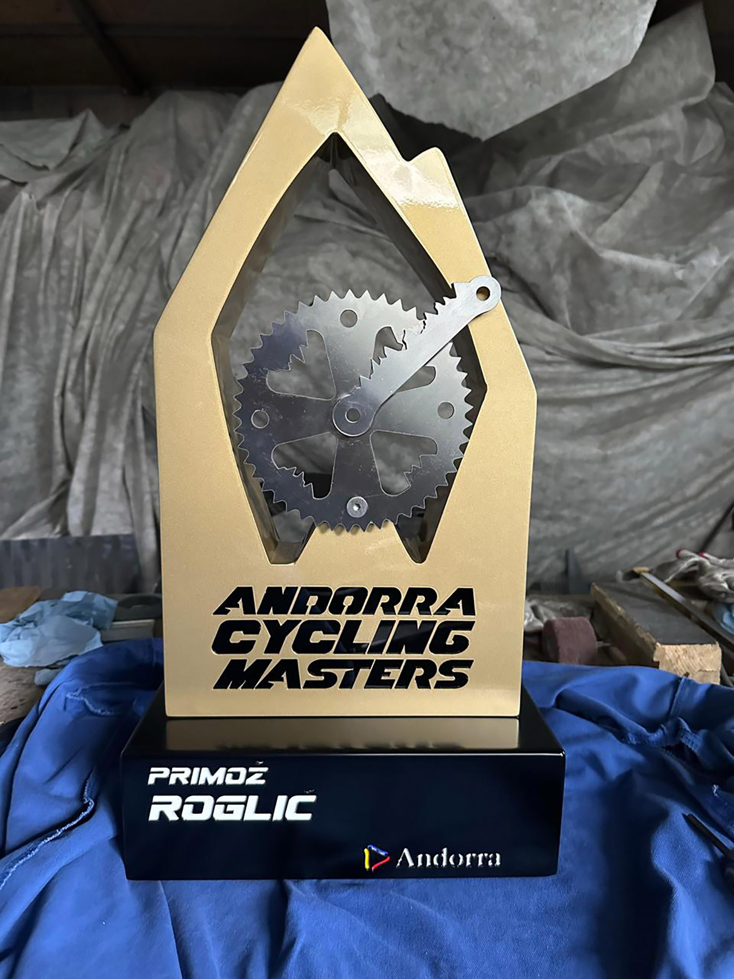 Potser s’ho van preguntar aleshores, i si no els ho expliquem igualment: el trofeu és una escultura que es titula Impuls, en paraules de Cruz “l’instant que separa el repòs del moviment i el moment en què la força interior es converteix en acció”. Vuit quilos d’acer daurat amb base de ferro de color negre i 60 centímetres d’alçada que simbolitzen, diu, “la força interior, la constància i la superació que defineixen l’essència del ciclisme”. Consisteix en un plat de bicicleta creat pel mateix escultor –inútil fer-lo rodar, no és funcional– amb el tall interior que evoca la silueta de les nostres muntanyes, igual que el marc que li serveix de suport: “Converteix la mirada en moviment i l’esforç en símbol, i combina artesania i tecnologia: tall làser, polit i acabat manual”.