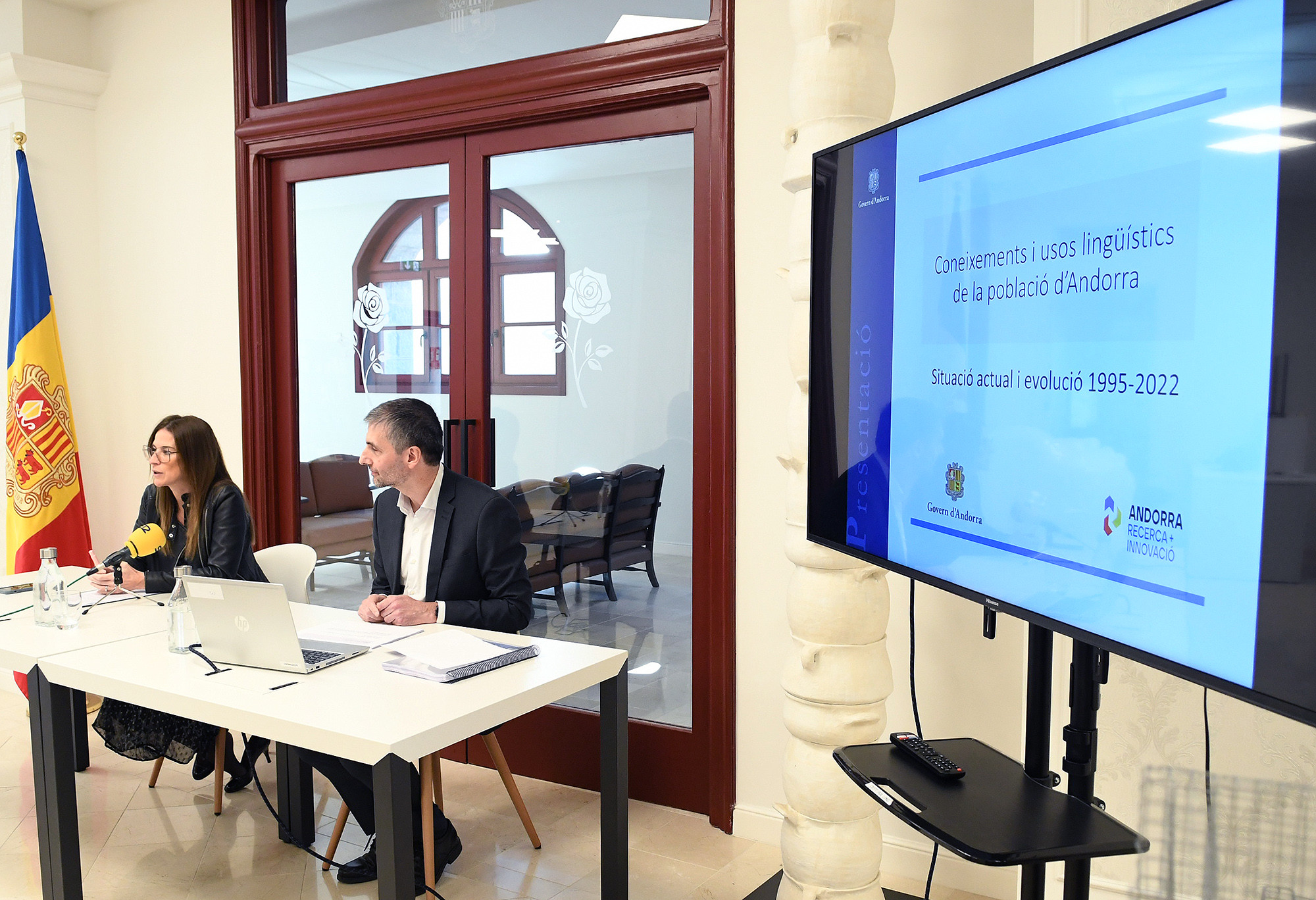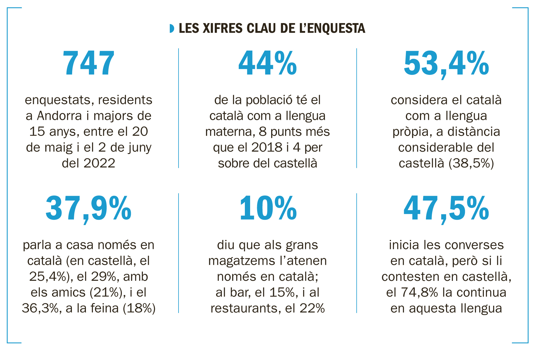 Així que durant els pròxims quatre anys podrem dir, amb les estadístiques a la mà, que el català és la primera llengua materna del país, amb un coixí de quatre punts sobe el castellà. Un altre indicador que avala l’optimisme de la ministra, que ha comparegut avui al Rosaleda acompanyada del coordinador de l’eix sociològic d’Andorra Recerca i Innovació, Joan Micó, és el de la llengua que els enquestats consideren com a pròpia, que en el cas del català s'enfila fins al 53%, a distància més que considerable del castellà (38%), i no diguem del portguès (12%) i del francès (6%). Ës clar que en aquest cas no hi ha cap daltabaix en la classificació perquè el català ocupa el primer lloc des de l’enquesta del 2014.