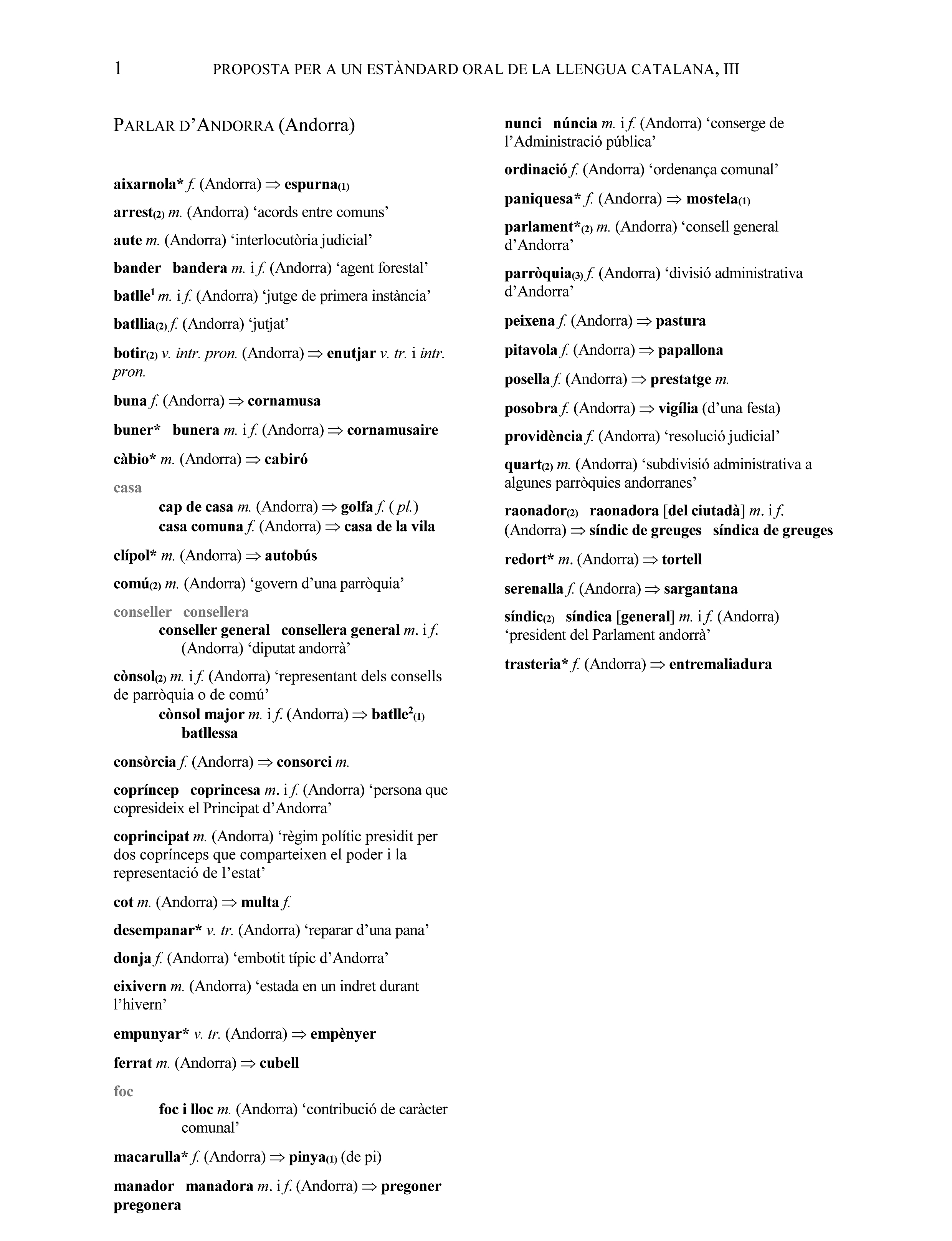 El que la Filològica anomena parlar d’Andorra inclou els 45 andorranismes que ja s’ha dit, exactament el 3% del total de 1.740 unitats lèxiques d’àmbit restringit i a distància considerable de les 771 del valencià, les 469 del balear, i les 286 del septentrional. Són, en canvi, un grapat més que les 36 del central, escassament representat en aquesta secció perquè la major part del lèxic del català central ja apareix entre els 21.385 termes al corpus general. Conclusió: “Els andorranismes hi figuren probablement en la proporció correcta al pes que tenen en la llengua. No hem de ser pessimistes: aquests 45 inclosos a la Proposta són el fruit d’una reivindicació històrica. Està bé. Potser ha arribat el moment que se’ns tingui una mica en compte i s’acabin incorporant el mig centenar que falten i que tenen arguments similars per ser-hi”.