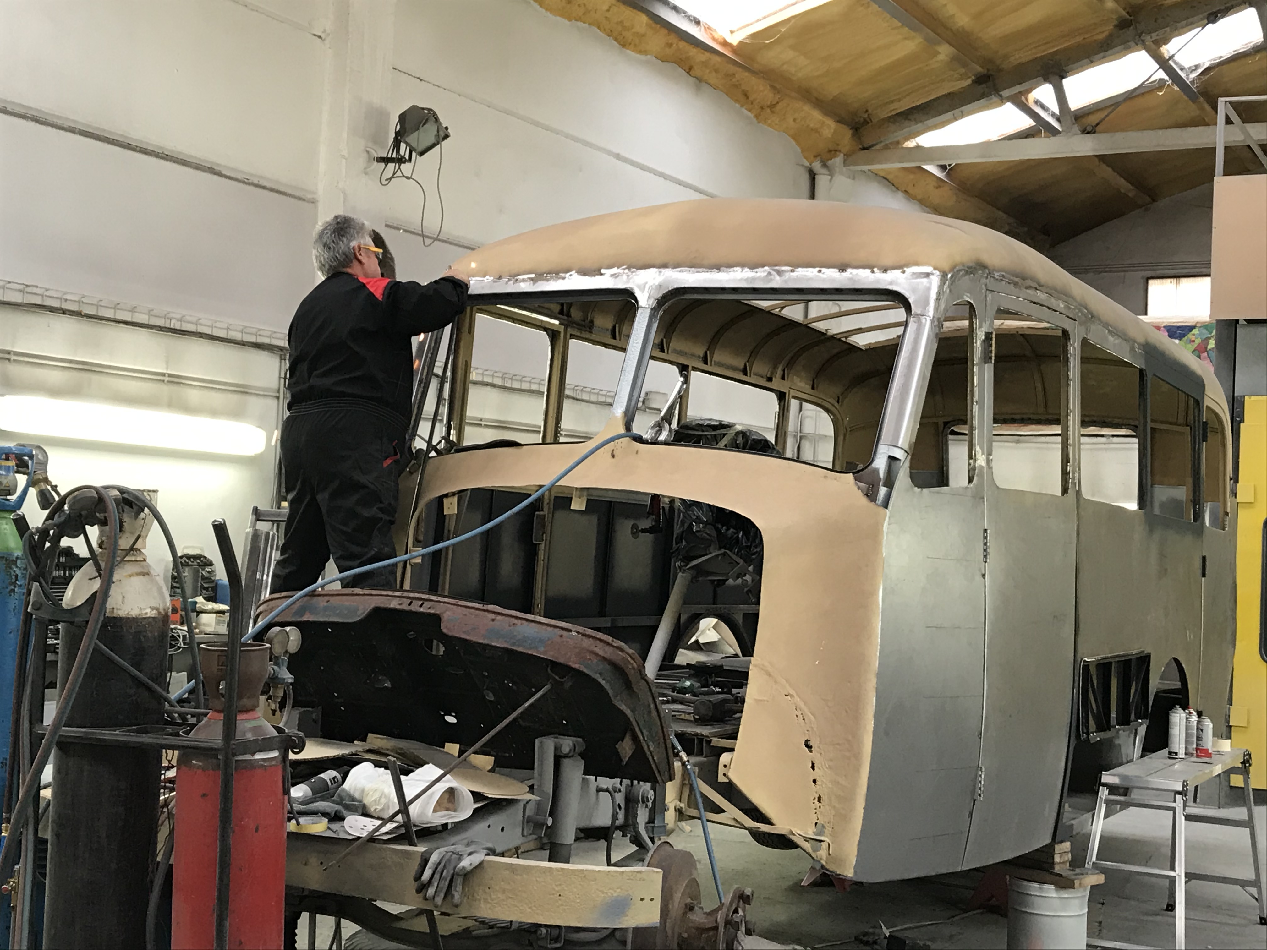 El punt d’inflexió va ser el sorrejat a què es va sotmetre la carrosseria als tallers del COEX, l’octubre de l’any passat: es tractava de dutxar l’estructura metàl·lica del vehicle amb partícules abrasives a alta pressió, per retirar-ne l’òxid que s’hi havia anat acumulant en les quatre dècades d’intempèrie. En va quedar la xapa despulladíssima, amb aquest color gris metal·litzat que s’intueix a la fotografia, però amb tots els forats que l’havien deixat com un colador i que el planxista va haver de tapar un a un, tallant pedaços de xapa a mida i soldant-los al xassís.