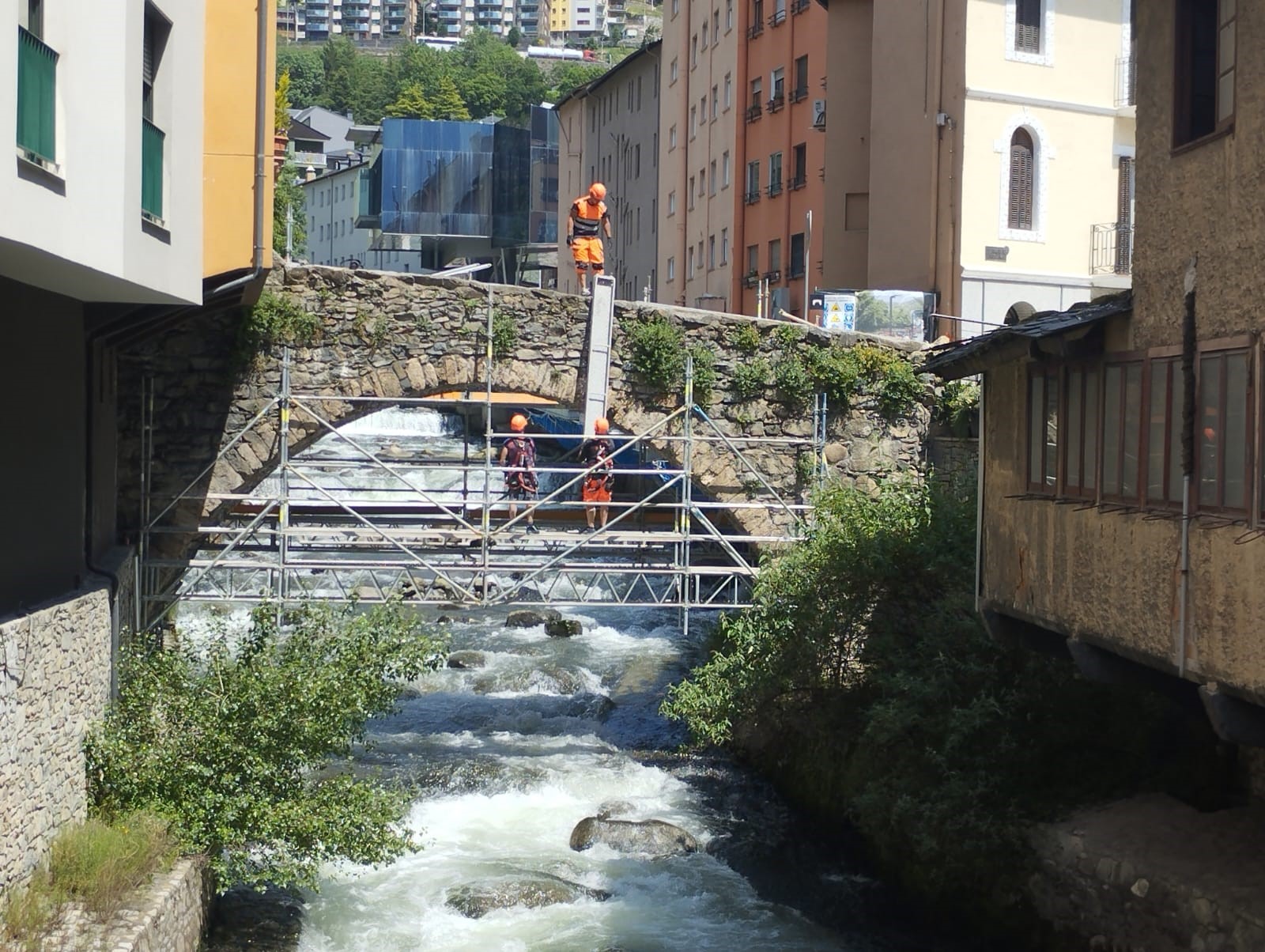 Els veïns d’Engordany es van endur ahir una grata (?) sorpresa: a mig matí una brigada d’operaris va procedir a tancar el pas i va començar a instal·lar bastides a banda i banda del viaducte. S’hi quedaran de moment un mes. Es tracta de la primera fase de la rehabilitació dels ponts històrics de la parròquia, que s’allargarà previsiblement durant tot l’estiu. El pressupost s’enfila a quasi mig milió d’euros, repartits a parts iguals entre el Comú i el Govern, i al pont d’Engordany li seguiran el de la Tosca i el dels Escalls, ja veurem en quin ordre. El torn l’ha obert, doncs, el d’Engordany. Recordin que el viaducte actual data del 1785, i que va substituir un d’anterior que es va endur aquell mateix any. Encara se’n conserva l’arrencada d’un arc al marge dret. En tots tres casos la intervenció consistirà a reforçar i reconstruir els ampits de pedra, anivellar-los i aixecar-los en els punts on són més baixos perquè no constitueixin un perill per als vianants. Es “purgaran” també, diu el Comú, els morters que lliguen les pedres, i es rejuntaran amb calç i sorra, i s’instal·laran gàrgoles de granit amb canals per evacuar l’aigua de pluja.