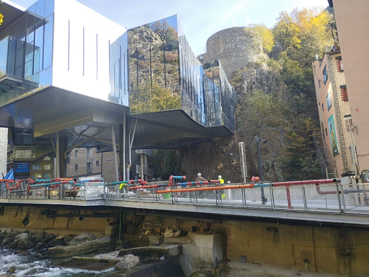 El primer tram del Projecte Caldes, entre el pont d’Engordany i la plaça dels safarejos –inclòs l’edifici Caldes, l’antic ArtalRoc, que en serà l’epicentre– obrirà al desembre, amb tota probabilitat a temps de les comunals, segons augura la cònsol major, Rosa Gili. La resta de la intervenció al passeig del riu, per darrere de l’hotel Carlemany i fins a la placeta del Madriu, s’ha retardat fins a la primavera. Un sensible retard respecte a l’optimista calendari que la cònsol va revisar a la baixa ara fa un any, quan van començar les obres. Gili havia retallat aleshores el termini dels setze mesos inicialment previstos a deu. Ara torna a les previsions inicials, tot i que al juliol es van obrir les terrasses del primer tram. Ja s’hi han instal·lat les canonades de colors, i falten les aixetes monumentals i acabar d’urbanitzar la plataforma inferior de l’edifici Caldes. Pel costat de la placeta del Madriu, se n’ha ampliat la superfície i l’últim que s’hi instal·larà serà la font escultòrica de Balmaseda. Les obres van començar el novembre passat i el pressupost s’enfila als 5 milions d’euros.