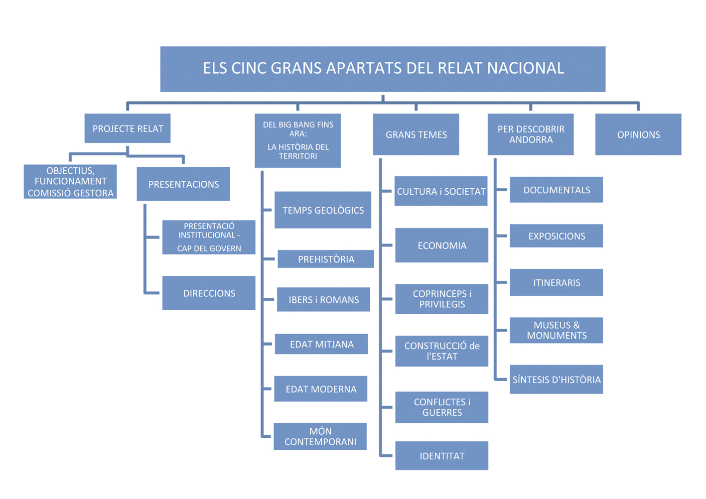 Com recordarà el lector, el primer projecte de relat el van liderar Xavier Llovera i Jordi Guillamet. Ells van ser els que en van concebre la columna vertebral, però se’n van acabar separant al juny després d’un seguit de desacords amb el ministeri. En va prendre el relleu una comissió integrada per la cap de Patrimoni, Cinta Pujal; la de la Biblioteca Nacional, Júlia Fernández, i la d’Arxius, Lídia Arbués, però l’esprint final l’ha capitanejat els últims mesos la historiadora Eva Arasa, avui a Patrimoni immaterial, amb Albert Villaró a la correcció dels textos. També ha canviat la denominació del projecte: sembla que hi ha hagut cert consens que relat nacional sonava massa rebuscat i s’ha optat per una solució més òbvia, més neutra i probablement més natural: Història d’Andorra, o una fórmula similar.