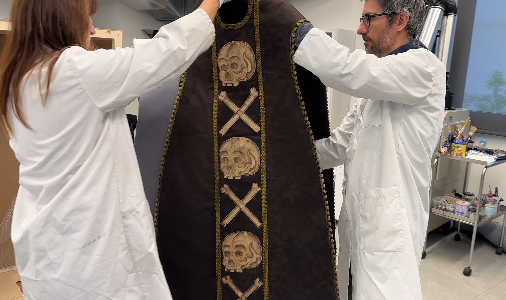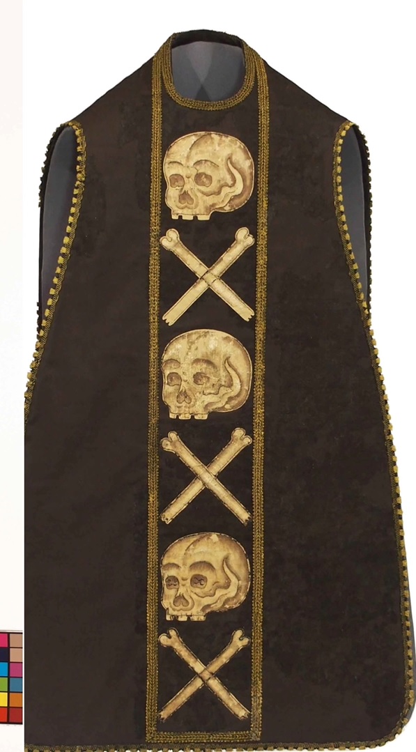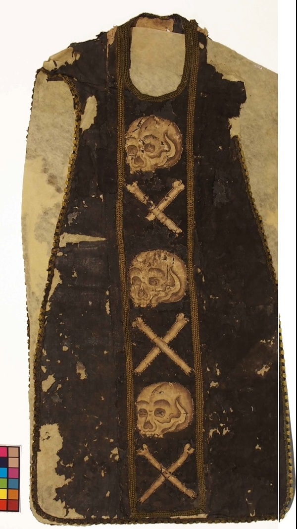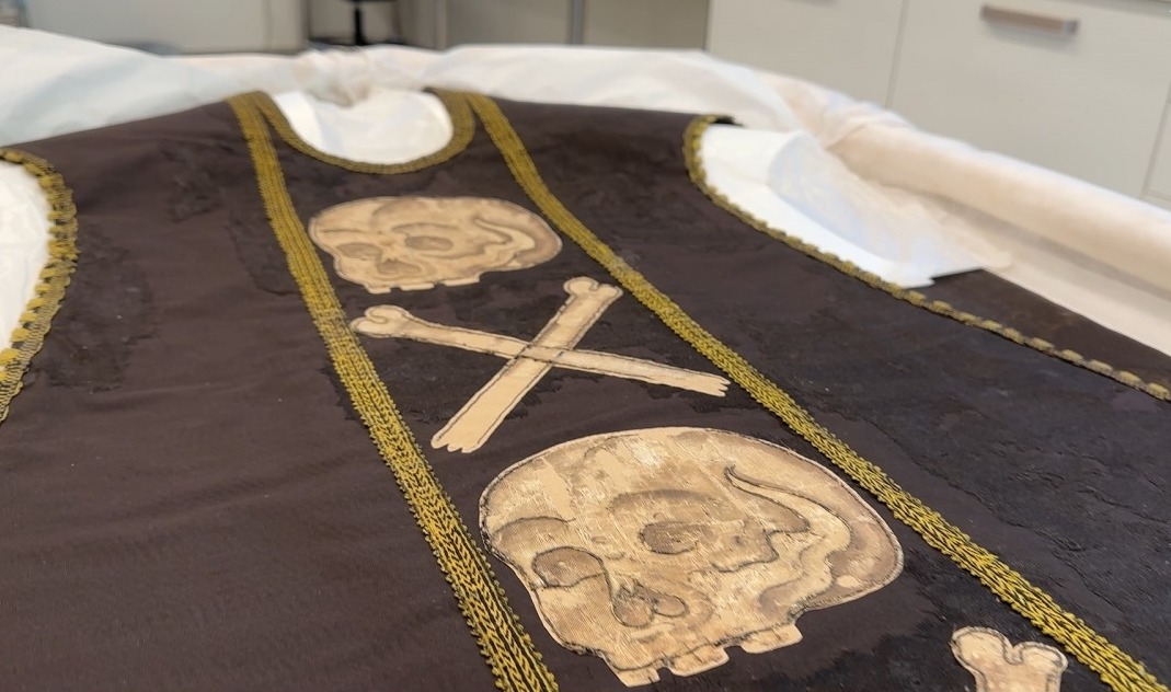Torna a casa, restaurada, la casulla mortuòria de la Cortinada, decorada amb un funest joc de tíbies i cranis i la més antiga que es conserva.