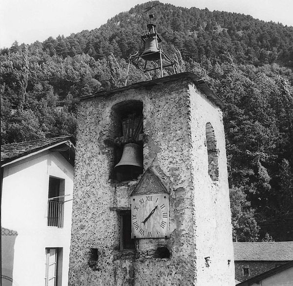 Però la de la creu de Lorena no és l’única foto amb sorpresa que ha aparegut els últims dies. Mirin un moment la d’aquí dalt: els costarà reconèixer-hi el campanar de l’antiga parroquial escaldenca de Sant Pere Màrtir, perquè va ser enderrocada als primers anys 50. Se’ls n’aniran els ulls al rústic rellotge que sembla marcar les 13.35 hores i al qual se li ha perdut la pista. Però fixin-se en les campanes. No els sobta res? Potser l’estructura metàl·lica que corona la torre i sobre la qual s’aixeca la més petita? Sabem que va ser fosa el 1899 i que avui es troba a Sant Jaume d’Engordany. I diu Robert Lizarte, autor de Homes i dones de Canillo, als auficis! i l’home que sap tot el que es pot saber sobre les campanes andosines, que li va sorprendre topar-se-la a sobre del campanar, i no a dintre, que és el seu lloc reglamentari.