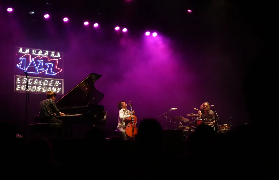 Tot i així, allí estava ell, fent cua un quart d’hora abans que obrissin les portes del Prat del Roure per descobrir el trio del pianista menorquí, que completen violoncel i percussions i que compareixia amb un repertori extret dels dos últims discos, Letter to Milos, el seu fill, un anyet, que ha aguantat el concert d’avui com un campió, i Talisman: “Per a mi és un grandíssim honor poder reinaugurar un festival que té tantíssima història. Deixin-me començar amb Naixement, amb l’esperança i el desig que aquesta etapa del festival d’Escaldes sigui per molts anys”.