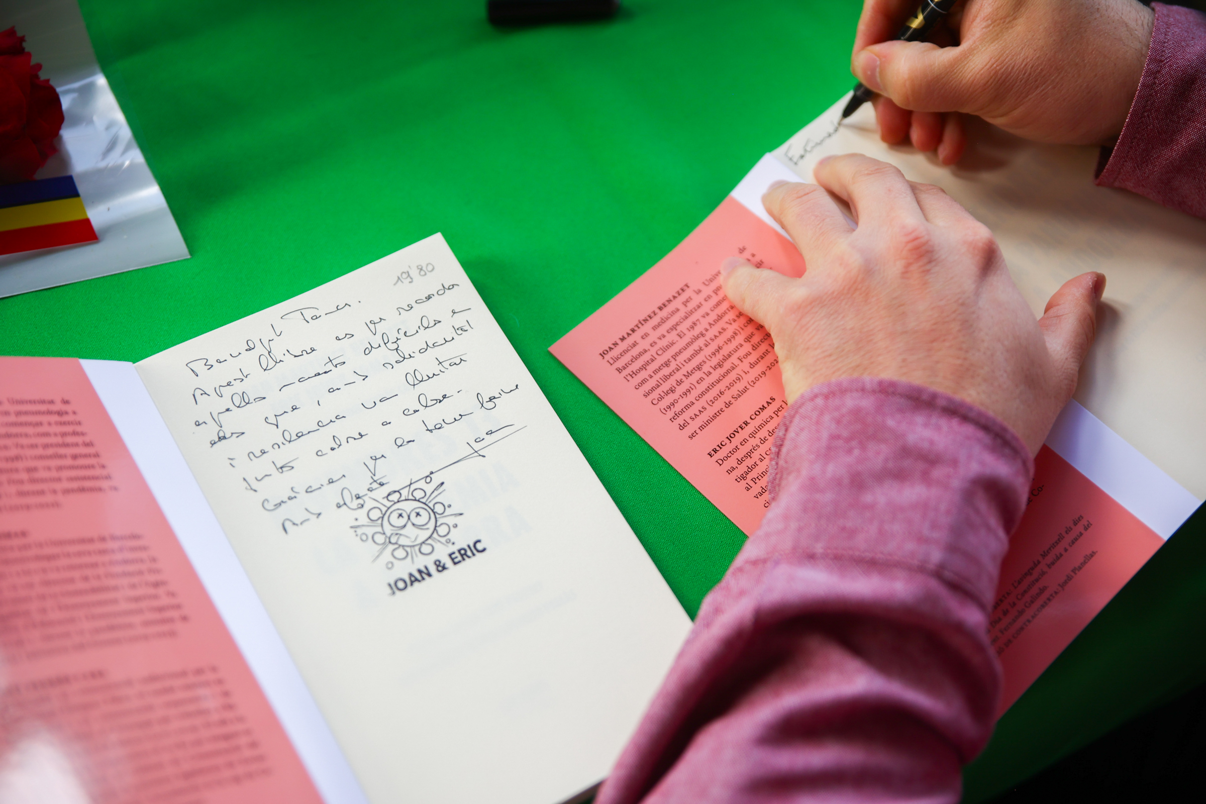 Com es tradueixen, a la pràctica, aquestes bones intencions? Doncs exactament així: "Estimada Àngels: tu més que molta gent sap que la pandèmia va ser un moment molt dur [cal dir que l'Àngels va passar per l'UCI i va necessitar ventilació mecànica]. Aprofito la dedicatòria per agrair-te tota la teva feina per la divulgació científica. Gràcies per tot el que fas per Andorra". Aquest és l'Eric; el Joan remata: "Com ens vas fer patir! Aquest llibre és perquè aquells moments no passin a l'oblit". I tot plegat rematat, atenció, amb la caricatura d'un SARS-CoV-2, el virus de la Covid, vaja, dibuixada per Jordi Planelles i que s'han fet imprimir en un tampó. Tot molt pro. És clar que venien entrenats perquè a la presentació escaldenca ho van petar.