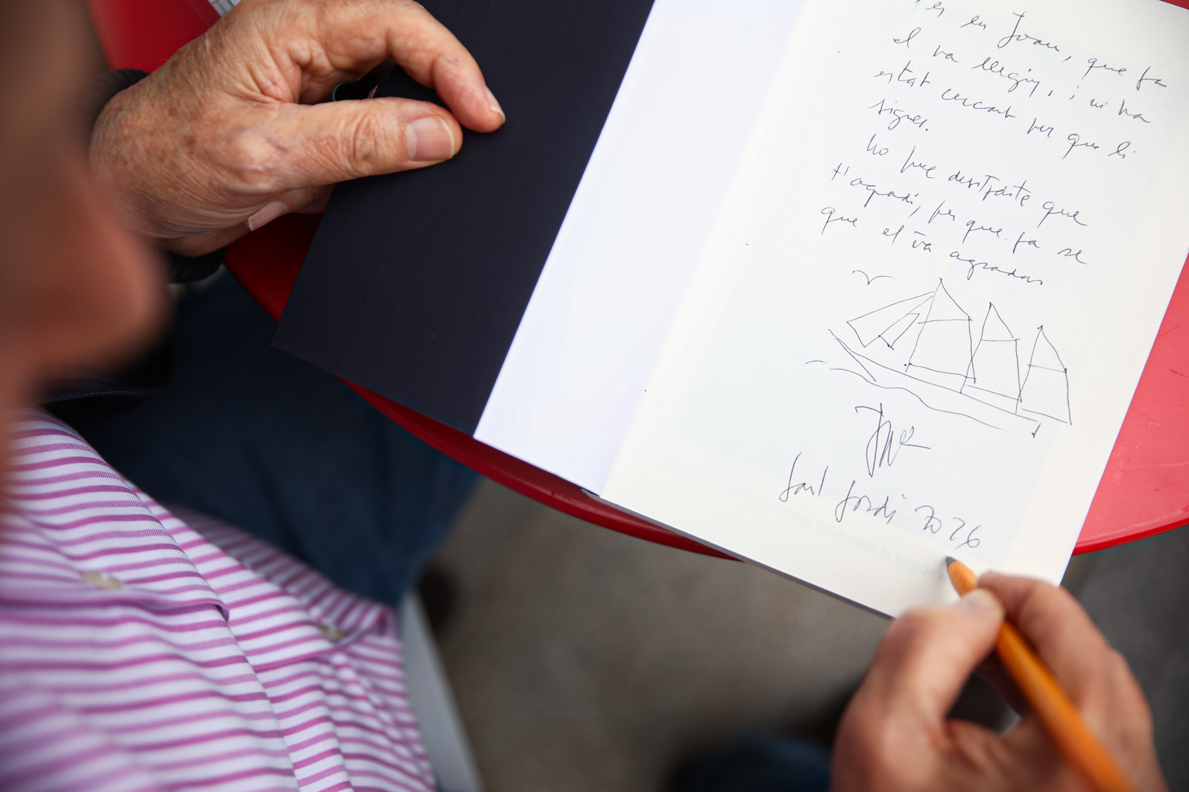 Jorge Cebrián també sap el que es cou en aquesta mena de cita a cegues estil First Dates que és el ritual de la firma, on autor i lector se la juguen en la distància curta. Però feia tres lustres, des de Els andorrans als camps de concentració nazis, que no sortia a la plaça. Ahir hi tornava amb L'estafador que va ser rei d'Andorra: "Si no el conec, li demano una mínima informació personal, si ha vist o no el documental, si coneix els personatges, per escriure una dedicatòria una mica més elaborada". Entén, celebra i disfruta el ritual de la firma, tot i que tan sols l'ha practicat una vegada com a lector –"A Madrid, fa molts anys, que em vaig creuar Carlos Ruiz Zafón pel carrer, i casualment duia un exemplar de La sombra del viento a sobre, però reconec que no soc dels que faria cua per una firma". I de la teoria a la pràctica. A ell li queden així: "Per al Jesús i la Carmeta, excel·lents veïns i persones. Desitjant que aquest llibre us descobreixi la vida d'un personatge fascinant. Amb tot el meu afecte".