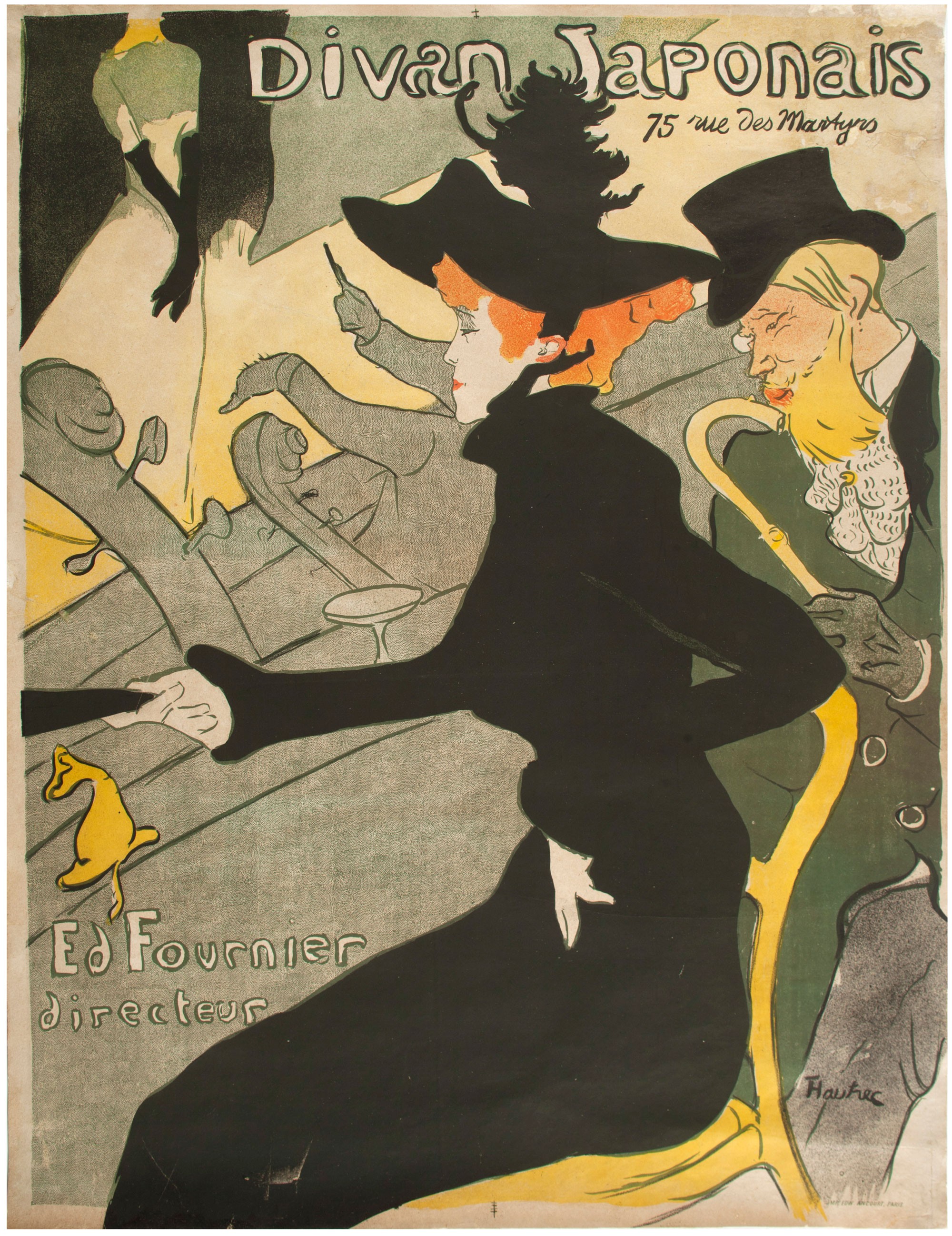 No hi faltaran alguns dels cartells icònics de Lautrec, des de Divan Japonais fins a Ambassadeur, on aprofita per retratar del poeta, cantant i noctàmbul Aristide Bruand, amb les inevitables escenes de prostitutes –Lautrec en va ser client habitual–, de ballarines, recordin Danseuse assise, i també de senyores i senyoretes a la toilette (Femme qui tire son bas). El més curiós de tot és que avui el recordem sobretot com a cartellista visionari, però tota la seva obra diguem-ne publicística es resumeix en la quarantena escassa de litografies que va tenir temps de fer en els seus 37 anys de (turmentada) vida.