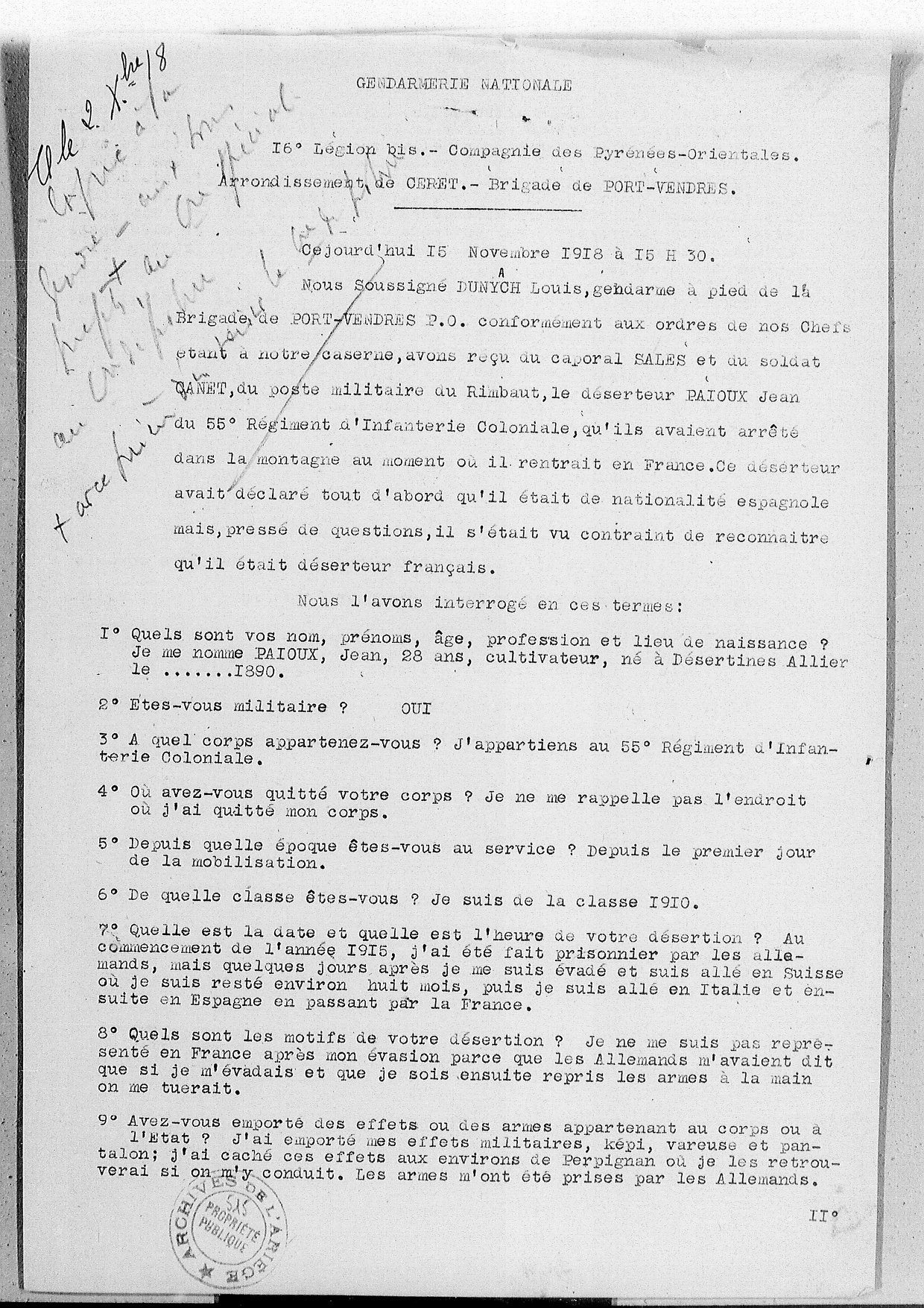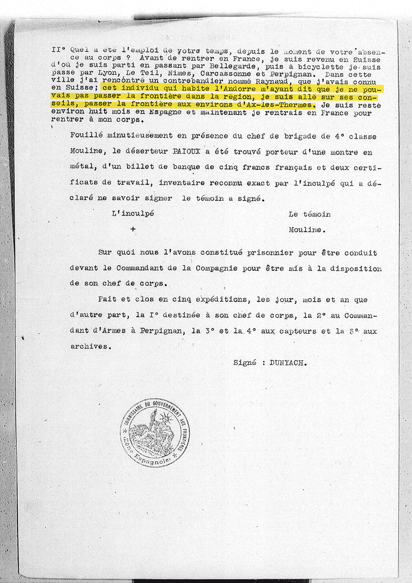 Paioux és un dels nostres deu desertors documentats. N’hi devia haver molts més perquè la correspondència entre els comandaments militars, el prefecte de l’Arieja i el comissari especial de Foix insisteix repetidament que cal reforçar la vigilància de la frontera francoandorrana. El juliol del 1918 el comissari de fronteres reporta l’arribada a la Seu (naturalment, a través d’Andorra), de cinc treballadors de la fàbrica de munició de Pàmies: Jacques Burbail, Jules Lamadeleine, Arthur Rivière, Paul Rançay i Jacques Lhortal. Al setembre del mateix any consta que dos desertors francesos s’han instal·lat a Soldeu, un és fill de la localitat d’Aston, i l’altre, de Mernes. I el gener del 1919 la gendarmeria en registra quatre més: Louis Paul Authier, Bernard Irard, Julien PIerre Carbonne i Benoît Durand, aquest últim resident a la Seu.