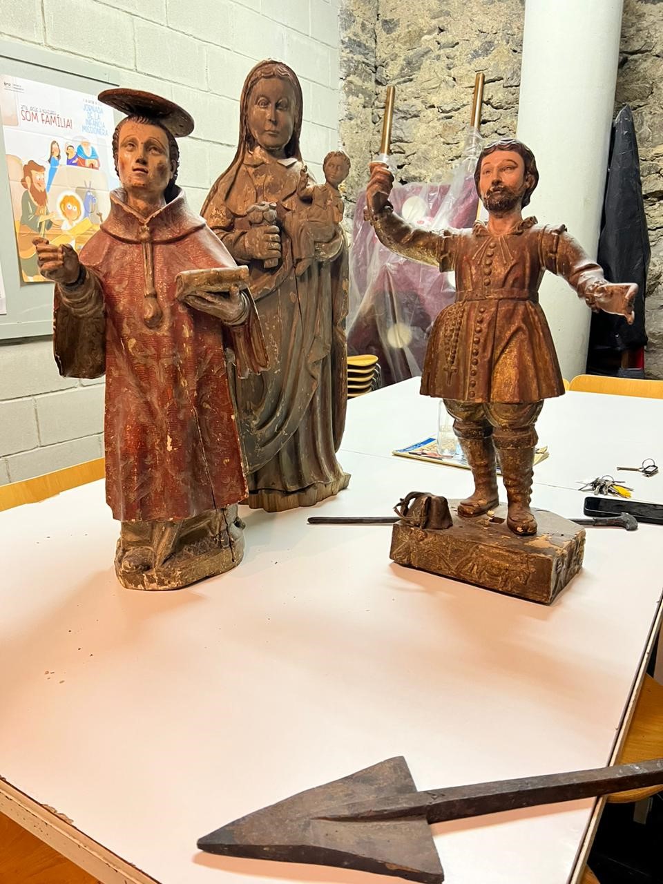 Si en parlem aquí i avui és perquè, convindrà el lector, la història és prou rocambolesca, i perquè la parròquia engegarà just després de Meritxell una campanya de micromecenatge per restaurar les dues talles i la Mare de Déu, que no és que estiguin especialment degradades però que han perdut tota la policromia. Es tracta, diu Lizarte, de continuar recuperant el patrimoni artístic del temple –recordin que al maig van tornar el frontal d’altar del XIX i dues talles més, un Sant Pau i un Sant Pere barrocs, després de passar pel quiròfan– i apel·lant a la sensibilitat dels fidels com el 2020 amb la campana de Sant Jaume dels Cortals que es va restaurar gràcies a una col·lecta popular. Les dues talles procedents de l’armari del tresor són, diu Lizarte, un Sant Isidre, un Sant Esteve, aparentment sortits de la mateixa mà i provinents d’un retaule que s’ha perdut. La Mare de Déu del Roser podria ser anterior, possiblement barroca, i procedir de l’antiga capella d’aquesta advocació que es trobava entre la del Roser i la de Sant Antoni. Però de moment tot són especulacions i bones intencions.