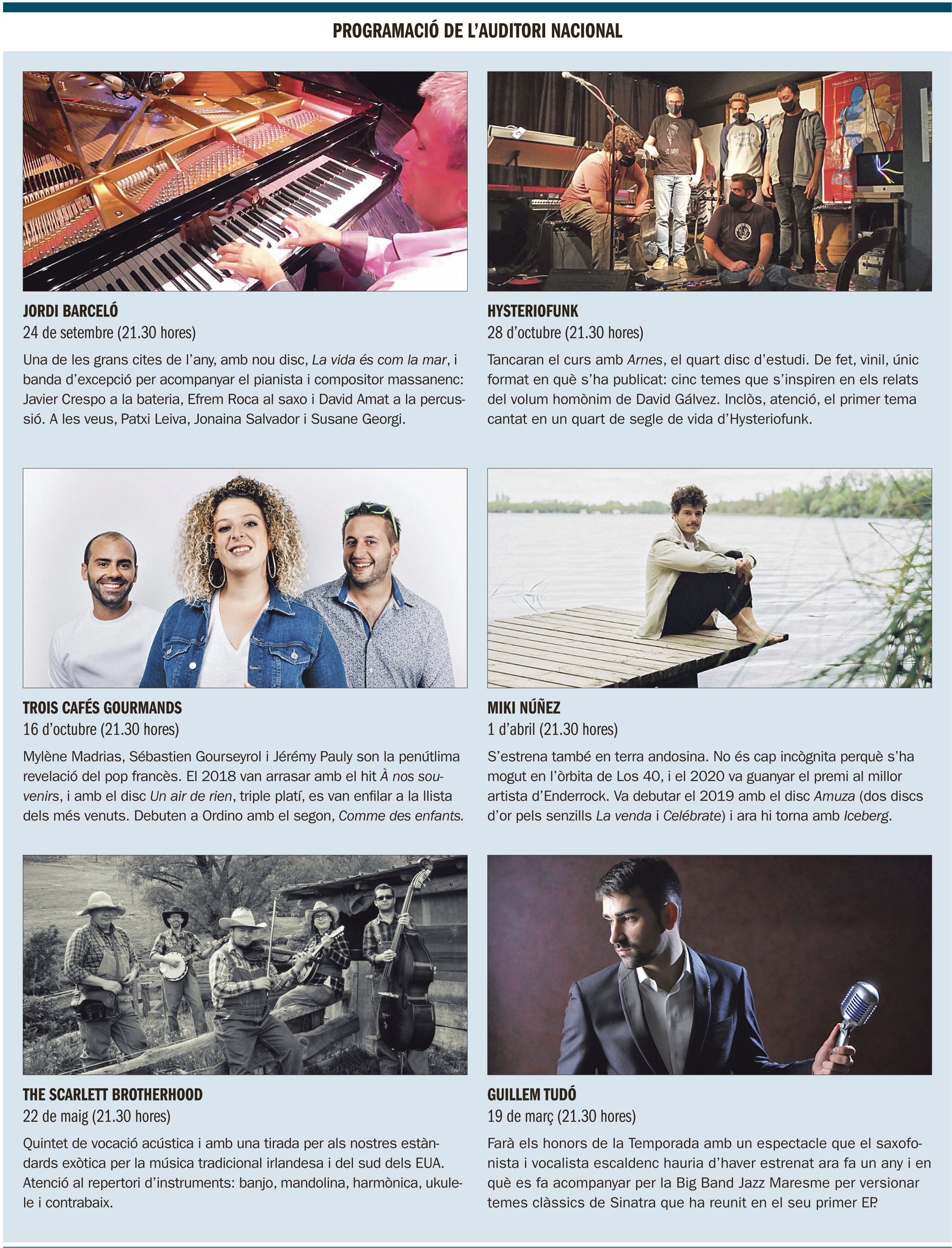 Això no vol dir que s’hagi proscrit els gran noms forans. Aquest any n’hi haurà dues pastilletes: el català Miki Núñez, revelació del pop espanyol beneït per Los 40 i amb què la Temporada intenta enganxar el públic jove, i Trois Cafés Gourmands, que posen per fi una pica francesa a l’Auditori, com és habitual gentilesa de l’ambaixada. Pel que fa a les propostes nacionals, reconsagrats com Hysteriofunk i Jordi Barceló comparteixen cartell amb una banda no precisament jove, però sí emergent, The Scarlett Brotherhood i amb els primers discos de Martha Roquett, Guillem Tudó i Sara Núñez.