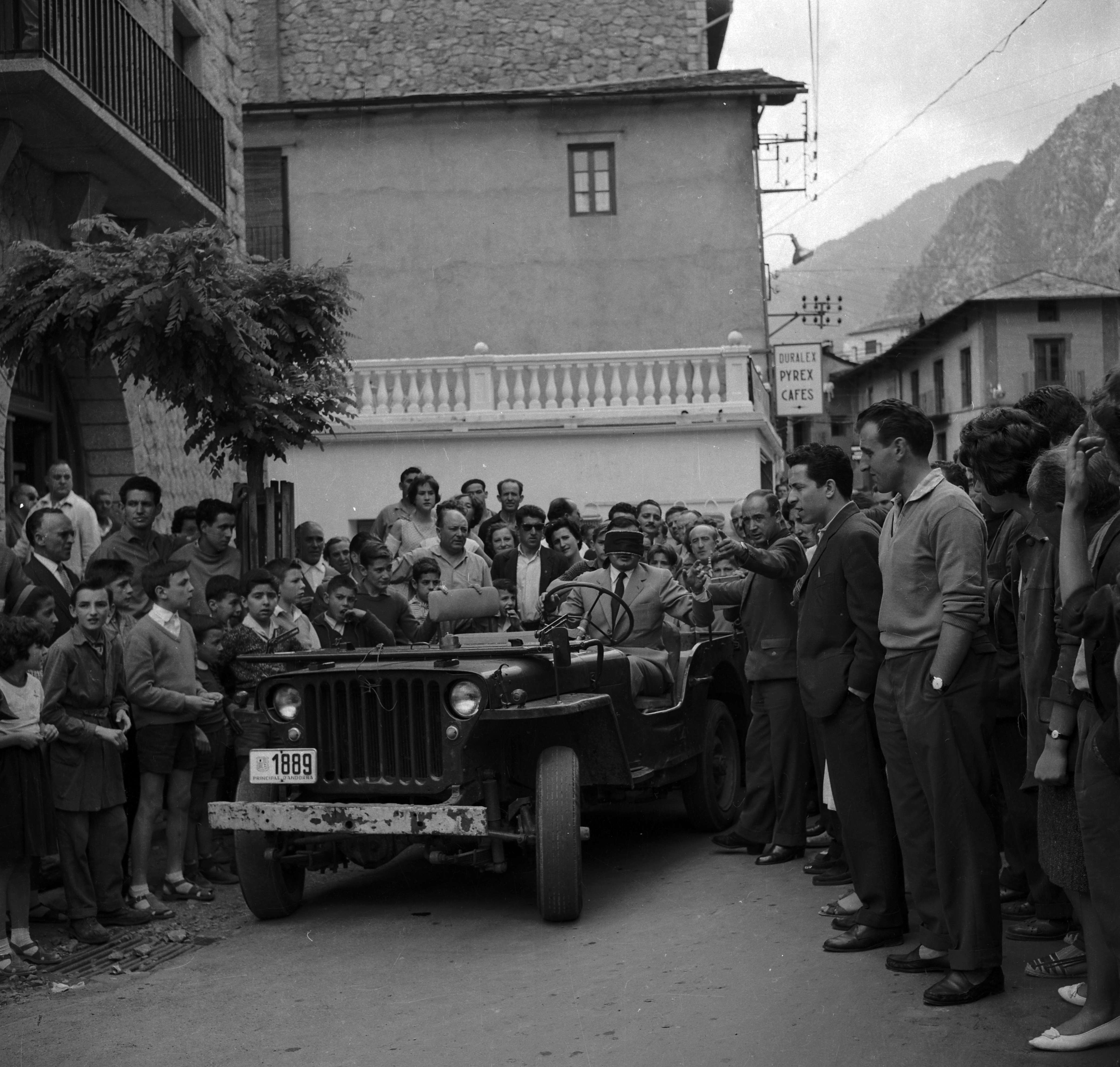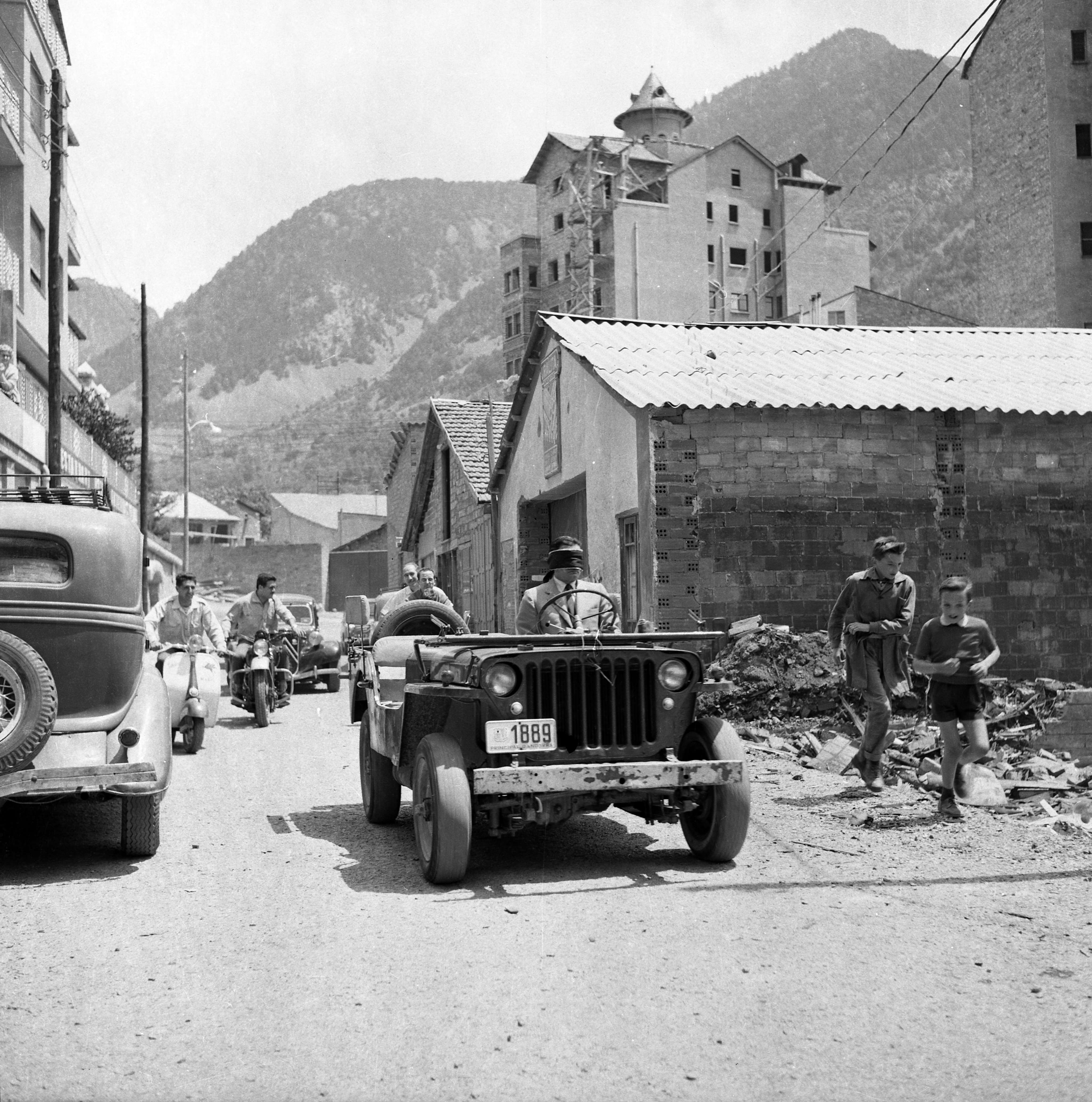 Però aquesta és una altra història. Tornem al nostre Fassman. La sèrie consta de quatre fotografies i la va prendre Fèlix Peig, qui si no, que s’havia establert entre nosaltres cinc anys abans i que es va convertir des d’aleshores en l’home que sempre hi era, el cronista necessari de la segona meitat del segle XX andorrà. Peig no va concretar gaire la data: 1957-1958, diu l’anotació del negatiu, i a partir d’aquí tot con conjectures. L’exhibició sembla que va començar a la plaça Benlloch, enmig de la reglamentària expectació popular. Fassman, en el moment àlgid de la seva carrera, es va fer cobrir, més aviat embolicar els ulls i es va posar al volant d’un jeep Willys supervivent de la II Guerra Mundial i amb placa 1889 i va circular, sembla, Meritxell avall en direcció Escaldes. Res més.