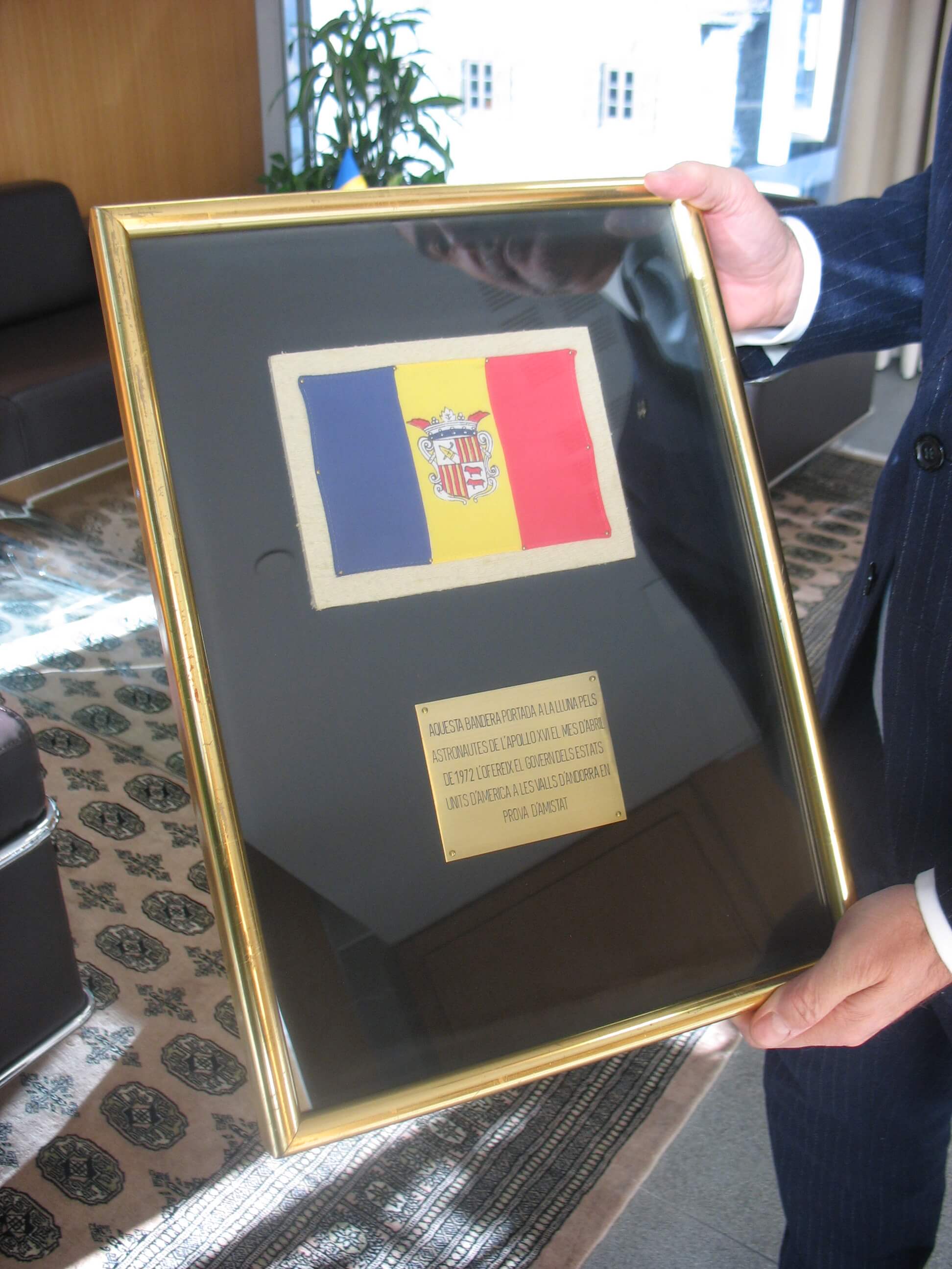 Doncs no no era gaire lluny: al despatx del síndic, al nou Consell General, exactament, visitable –ja que en parlem–, en la jornada de portes obertes que cada 14 de març s’organitza amb motiu de la Constitució. I ben a la vista: és el primer quadre que un es troba quan hi entra, ben bé al costat de la porta. Val a dir que això no ha sigut sempre així. Diu Mateu que el va trobar embolicadet al magatzem, i que va decidir exhumar-lo a l’hora de decorar el despatx. També, que en desconeixia l’origen, més enllà de la inscripció que l’acompanya: “Aquesta bandera portada a la lluna pels astronautes de l’Apol·lo XVI, el mes d’abril de 1972, s’ofereix del Govern dels Estats Units d’Amèrica a les valls d’Andorra en prova d’amistat”.