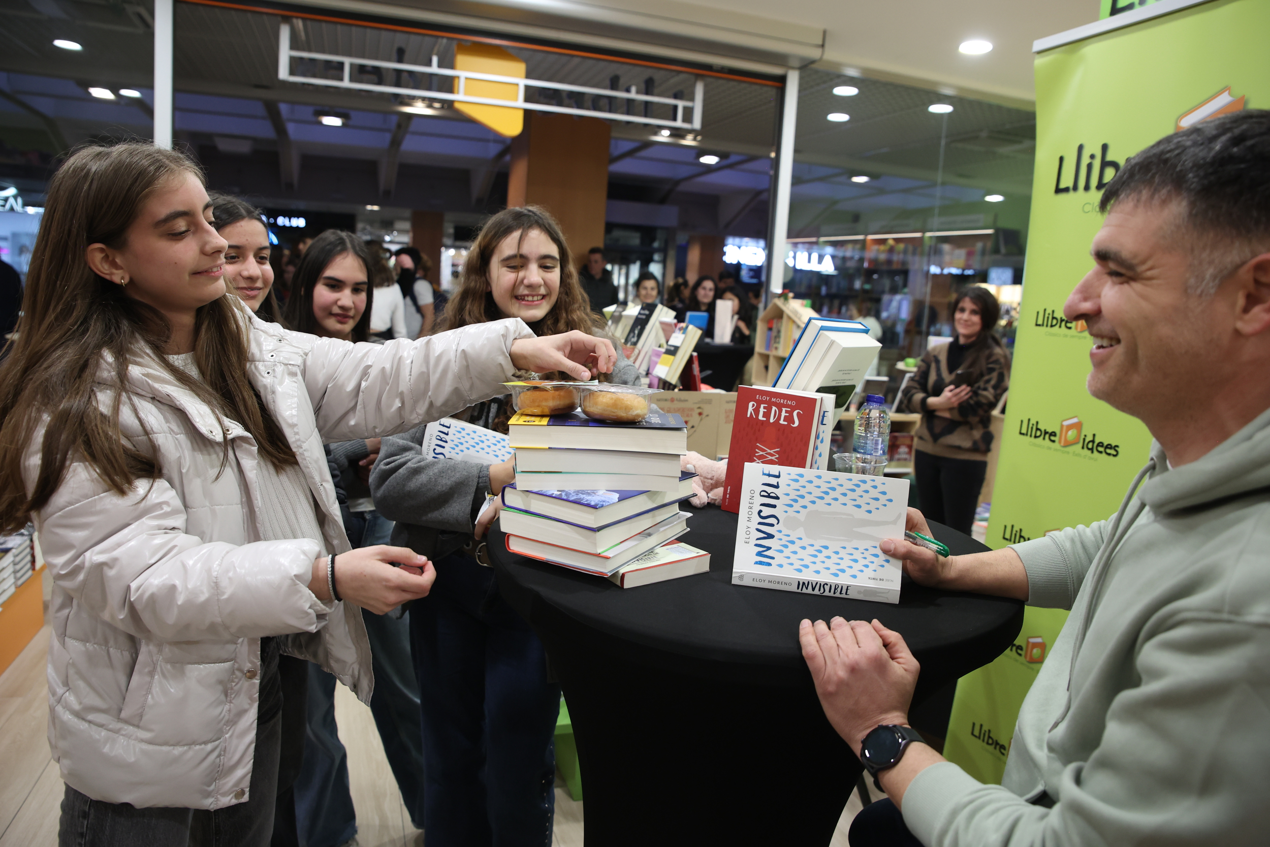 Es veu que encara li quedaven ganes de firmar, i això és el que va fer ahir a Illa Carlemany. No van ser 11.088, però ens hi juguem un peix que van ser més de mig miler. L’home va aguantar al peu del canó dues hores i mitja, i no es va aixecar de la cadira fins que van haver passat tots els que esperaven la seva firma. Tots. No se’n va saltar ni un. Les primeres a desfilar van ser la Youwana i la Lola, totes dues estudiants del Lycée. La Youwana s’hi va plantar amb tota la lleixa de l’autor: vuit novel·les, vuit. I l’Eloy, tot un cavaller, se les va firmar totes. És clar que gairebé el va subornar: a canvi, la Youwana i les seves amigues li van portar un parell de dònuts i xocolatines. Així, qualsevol: “El vaig descobrir un dia a l’FNAC. Per casualitat em vaig posar a fullejar Redes, em va enganxar i me’l vaig acabar comprant. Després van anar caient Invisible i tot els altres. Avui m’he comprat Cuando era divertido, que ja sé que és per a lectors més grans, però estic segura que també m’agradarà”, diu la Lola. Per què? Toca temes que als adolescents ens afecten de molt a prop. Amb el protagonista d’Invisible [que toca l’assetjament] m’hi vaig sentir molt identificada perquè parla de coses que jo mateixa he viscut”. Dedicatòria: “A Lola, que tu felicidad no dependa de otros”.