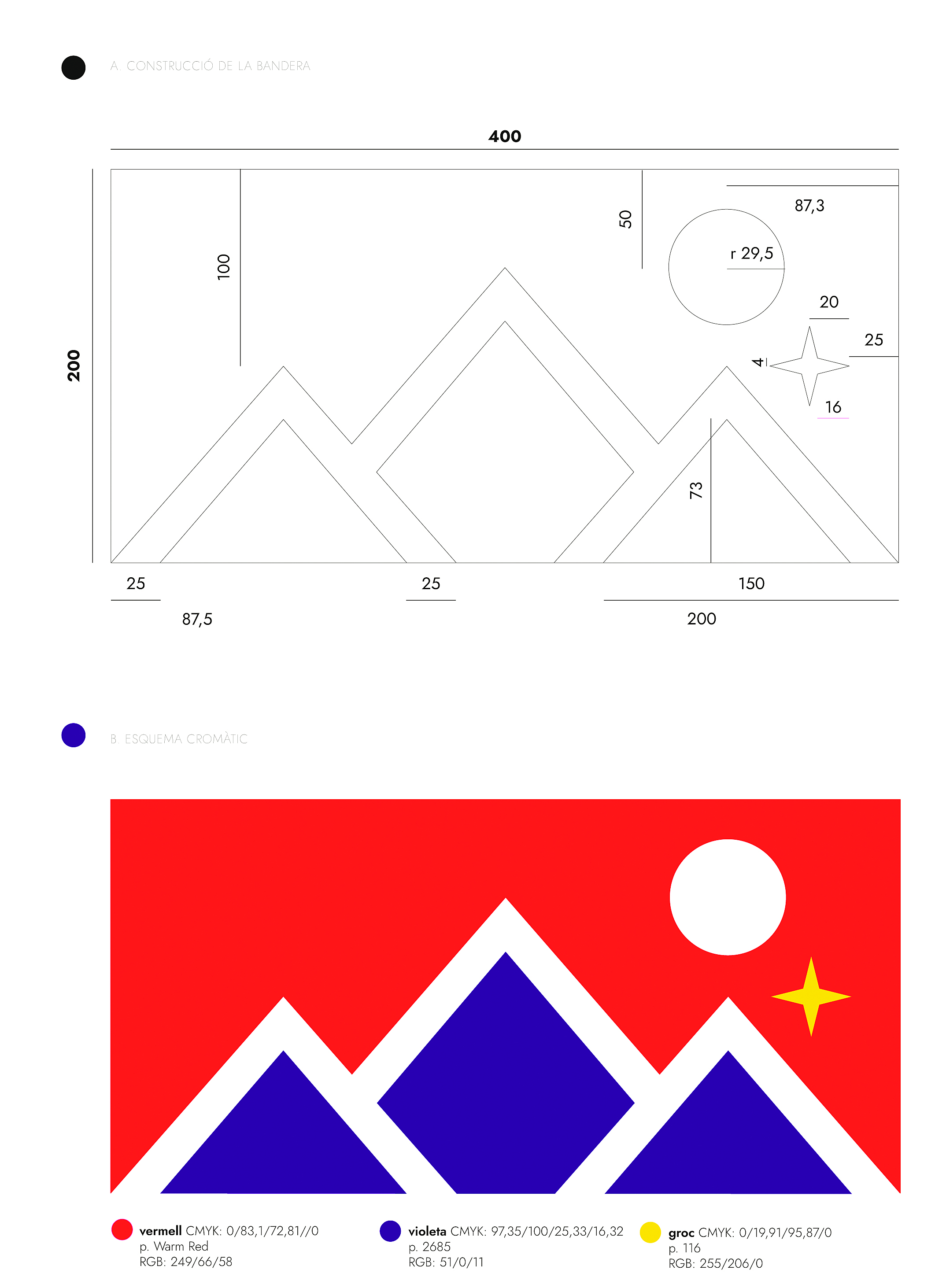 La tenen aquí dalt en tota l’esplendor, perquè val més una imatge que mil conceptes vexil·lològics. Encara que ho sembli, cap element és fruit de l’atzar o el capritx. D’entrada, l’objectiu primigeni de tota bandera, recorda Avià, és que es distingeixi com més lluny millor. I aquí el cromatisme hi juga un paper destacadíssim. Vegem-ho. El vermell del cel, diu, remet a la llegenda grega que és en l’origen del nom de la carena, pel foc (piros) que els pastors protopirinencs encenien dalt de tot dels nostres cims i que els mariners grecs veien des dels seus trirrems. El blau, al to (blavós, diu) que les muntanyes adquireixen en certes hores del dia. I el blanc del siluetejat al·ludeix a la neu i la lluna. Sobre el paper, aquesta combinació de colors és més visible que una altra que es basés per exemple en el verd. I a més, els colors triats remeten als de les banderes de les nacions històriques, diu Avià, i dels estats vinculades als Pirineus. És una obvietat que tant el blau com el groc i el vermell tenen per a nosaltres un aire familiar.