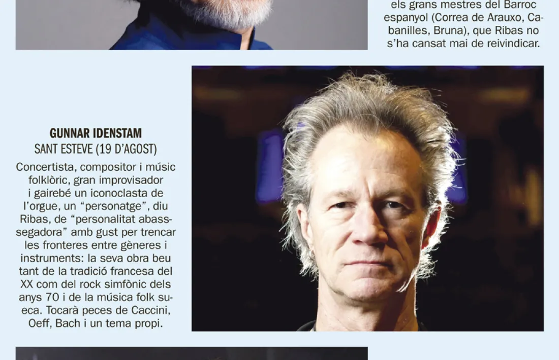 La resta del programa no hi té res a envejar. Per començar, l’insòlit duet, per no dir-li duel, que el mateix Ribas i el seu fill Aaron –exorganista de Sant Iscele i de Sant Pere màrtir, avui ho és a la parròquia madrilenya de Santa Rita– protagonitzaran el 13 de maig a la Massana, amb un segon orgue instal·lat per a l’ocasió a l’altar de Sant Iscle i obres dels gran repertori del XVIII espanyol, que Ribas Sr. no es cansa mai de reivindicar. El festival ha prestat aquest curs especial atenció a la música folklòrica, i a banda d’Idenstam programarà l’organista aragonesa Ana Mínguez i el duet El mantel de Noa (arpa i samfoina), el 12 d’agost a Sant Iscle, i el duet Ignacio Arakstain & Peio Irigoien, amb un repertori expressament escrit per a orgue i txistu. Txistu, sí: serà aSant Pere màrtir, 14 d’octubre. Completen el cartell l’organista francès Olivier Penn (Sant Esteve, 11 de novemrbe, obres de Bach i Franck), el duet d’orgues Ana Aguado & Ana Belén García (Sant Esteve, 28 de desembre), i el concert que l’organista alemany Michael Utz oferirà amb el guanyador del Sax Fest (9 de novembre).