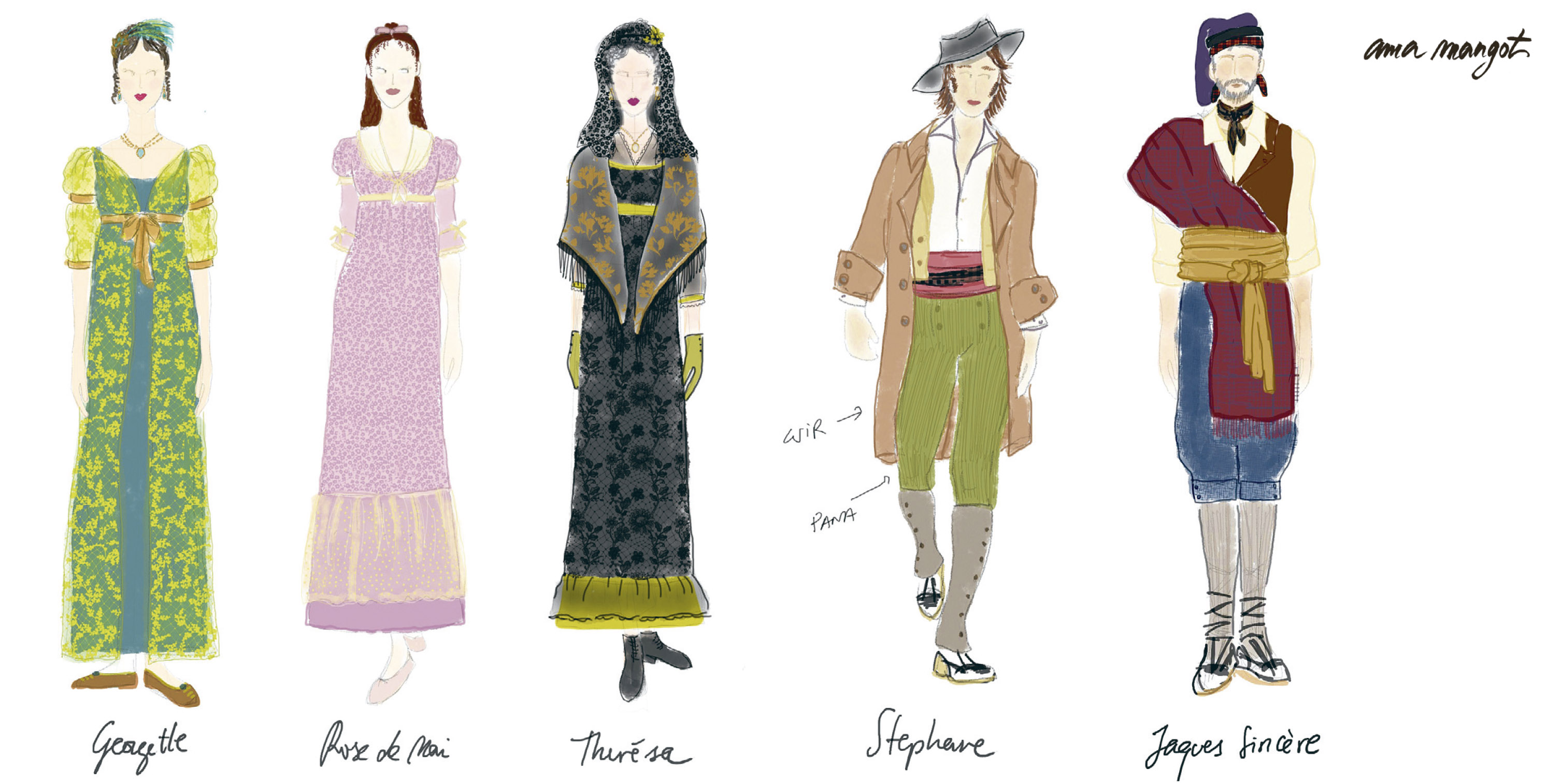 Es tracta, recordin, de recrear els amors de l’orfeneta Rose de Mai i el bon Stéphan, caçador de professió i un dels quinze joves andorrans que França pretén reclutar per a les seves guerres en les nostres no tan neutres Valls. Rose, en fi, li pispa uns dinerons a la pagesa per a qui treballa, que no és altra que Théresa i que també estima d’amagat Stéphan. Tot s’acaba sabent, com era previsible, i la pobra noia és conduïda davant d’un pintoresc tribunal que no respon al nom de Corts, sinó de consell d’ancians. Només la intervenció providencial del vell cabrer evita que Rose acabi al patíbul. Però atenció, espòiler, en un altre sensacional gir del guió resulta que Rose és ni més ni menys que filla de Théresa. Tot això, que a l’òpera còmica d’Halévy passava a l’etern regnat de Lluís XV (1715-1774) s’ha traslladat a la versió d’Andorra Lírica al segle XIX, en ple Romanticisme. Per fer-se’n una idea, vegin aquí dalt els figurins d’Anna Mangot.