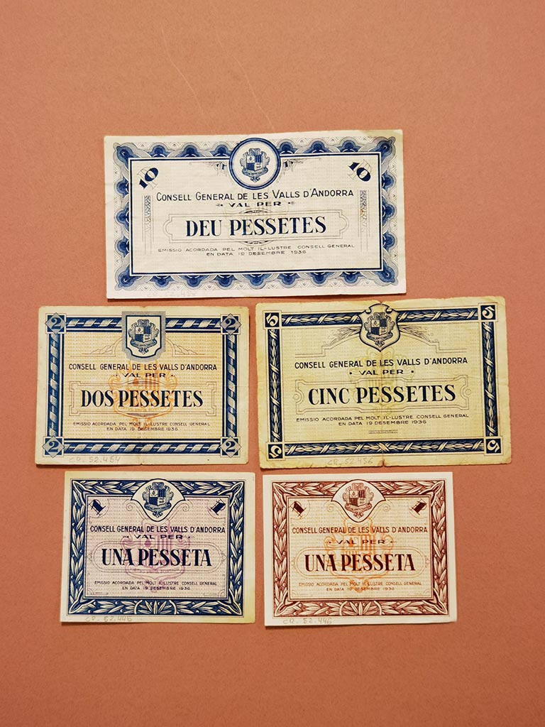 Si en parlem avui i aquí és perquè aquesta singular emissió és la protagonista de la Peça del mes de l’Arxiu, i no deixa de ser curiosa la forma com es justifica l’operació de fabricar bitllets, forma clàssica i directa per generar inflació, probablement l’única sortida quan els bitllets i monedes de curs legal desapareixen de la circulació per pura prudència i que van posar en pràctica molts ajuntaments catalans i espanyols durant la Guerra Civil. Segons el Consell, “aquesta alta corporació administrativa, fent-se càrrec de la greu dificultat i danys que sofreix el país, acorda crear i posar en circulació un paper moneda andorrà emès en pessetes amb el sol fi de donar facilitats a les operacions comercials dintre del territori d’Andorra”.