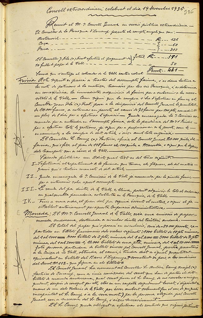 Atenció a la responsabilitat que va caure sobre el bon Antoni Camp Arajol, el Sastrico d’Encamp, el 19 de desembre del 1936. El Consell General acabava d’autoritzar l’emissió de paper moneda, extraordinària perquè era la primera vegada com a mínim des dels temps de la llegendària ceca que s’imprimien bitllets entre nosaltres. Era als inicis de la Guerra Civil Espanyola, i com diu l’acta redactada pel secretari Bonaventura Riberaygua en perfecta i claríssima cal·ligrafia, “trovant-se les Valls d’Andorra mancada de moneda menuda per a tornar els canvis, motiu pel qual s’efectuen les transaccions comercials amb molta dificultat”.