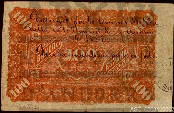 Es poden imaginar, en fi, les carreres que hi devia haver l’abril del 1939 per bescanviar al banc els papers aquests, i de passada les monedes i bitllets republicans que probablement s’havien ocultat prudentment a casa. Al costat d’això pot semblar una anècdota –i ho és, però suculenta– el bitllet de 100 pessetes fals com un duro sevillà que el cònsol de Canillo va entregar al Consell de Sant Andreu del 1887 i que es va dipositar degudament a l’Arxiu de les Sis Claus amb la següent anotació manuscrita: “Queda inutilisat per fals”.