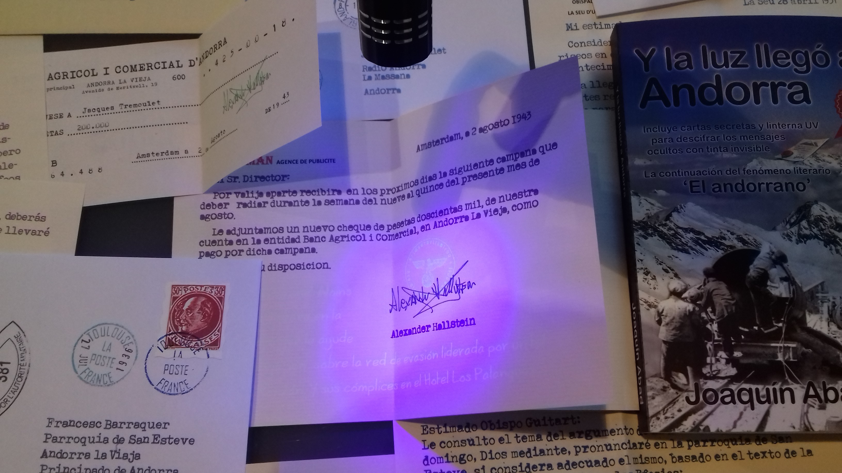 Un suculent intercanvi epistolar que reflecteix la preocupació pel clima revolucionari que es respirava per aquí dalt aquell any sensacional, i que inclou missatges escrits en tinta invisible que el lector pot desxifrar gràcies a la llanterna de llum ultraviolada amb què es ven el volum. La cosa es posa especialment interessant quan arrenca la II Guerra Mundial i el protagonista de Y la luz llegó a Andorra, que ja s’havia fet la barba d’or escanyant els obrers de Fhasa, descobreix un altre filó d’or: el tràfic de fugitius pels Pirineus. Entre les cartes amb què Abad amenitza la lectura hi ha –no se la perdin– el xec per valor de 200.0000 pessetes que un tal Alexander Hallstein, en nom d’Adman, agència de publicitat holandesa, li fa arribar el 2 d’agost del 1943 a Trémoulet. Atenció al missatge xifrat: “Las cuñas deben radiarse exactamente en el horario señalado. Es importante que el margen de error no supere los cinco segundos para que los agentes que están atentos a los mensaje los interpreten adecuadamente”. Radio Andorra, Trémoulet, nazis... Glups.