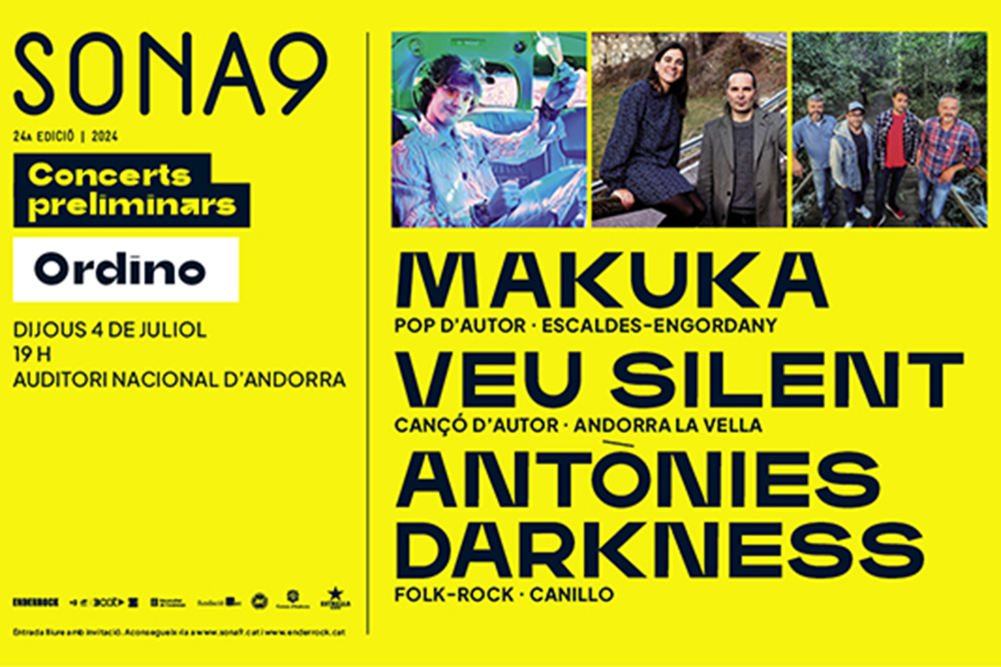 El jurat del Sona 9 ha seleccionat les 30 propostes classificades per a la següent fase del concurs, entre les quals hi ha Makuka, Veu Silent i Antònies Darkness. Tots tres oferiran, el 4 de juliol a l’Auditori Nacional, una actuació de 20 minuts durant la qual hauran d’interpretar temes propis en català davant del públic i jurat, format per representants d’Enderrock, TV3, iCat i Cases de la Música, el cantautor Lluís Cartes, que va ser el primer artista andorrà a guanyar el Sona 9, la pianista Teresina Serra i el compositor Toni Gibert.