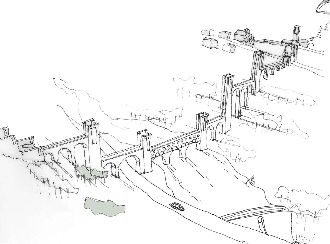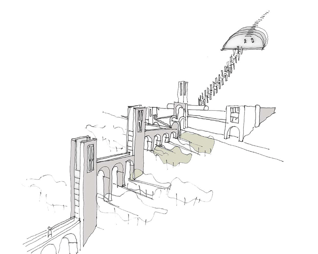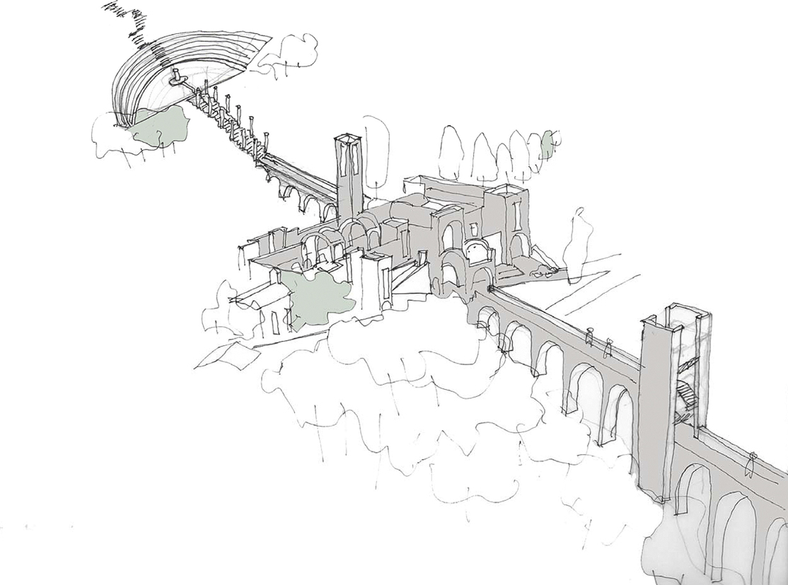 Enric Dilmé reinterpreta el projecte original de Bofill i companyia a partir dels dos esbossos que n’ha conservat Pere Aixàs, partenaire andorrà en aquella fase incipient. La proposta tallava perpendicularment la vall amb un viaducte que acabava en sengles amfiteatres a banda i banda.