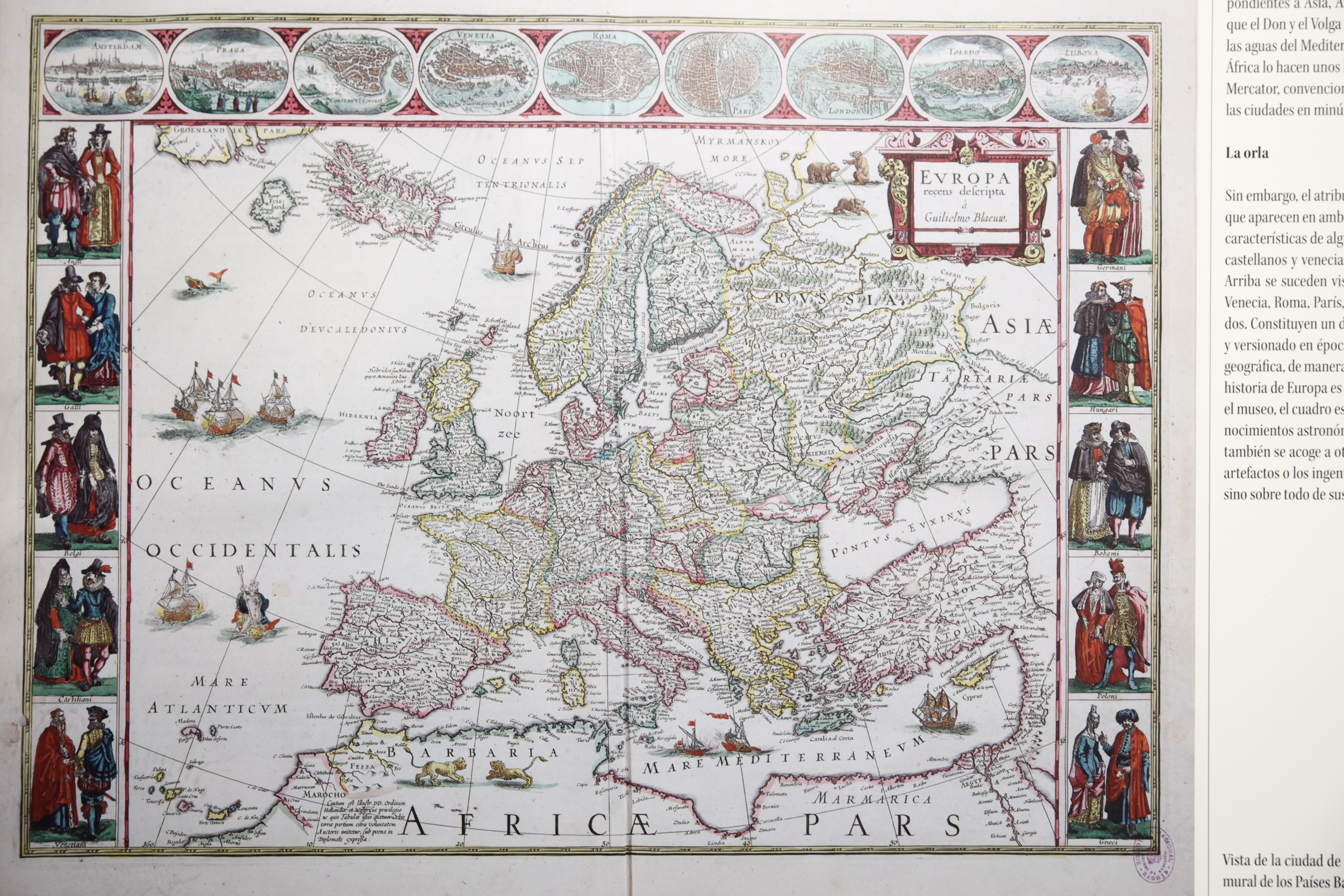 Pimentel, en fi, té especial carinyo al mapa de Louis Charles Desnos, del 1761, envoltat d’escenes costumistes, i al de William Blaeu, cim insuperat de la cartografia universal (1640). Però el que més ens interpel·la és, diu, el del 1919, que reflecteix l’Europa sortida del Tractat de Versalles que va posar fi a la I Guerra Mundial i on sorgeix un rosari de nous països –els bàltics, Txecoslovàquia, Iugoslàvia– que faran implosió amb la caiguda del Mur de Berlín, el 1989, i que han marcat des d’aleshores el ritme i el rumb de la història d’Europa. Que per cert, per als grecs i tots els que van venir després era tot el que hi havia a l’Oest del Mar Negre.