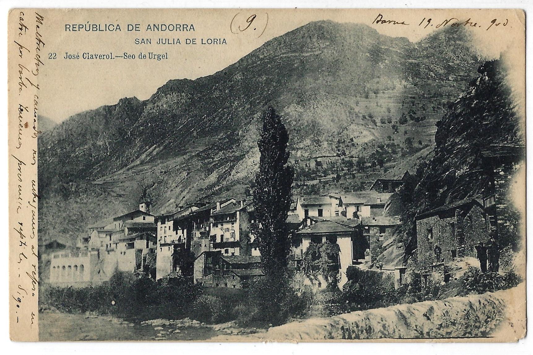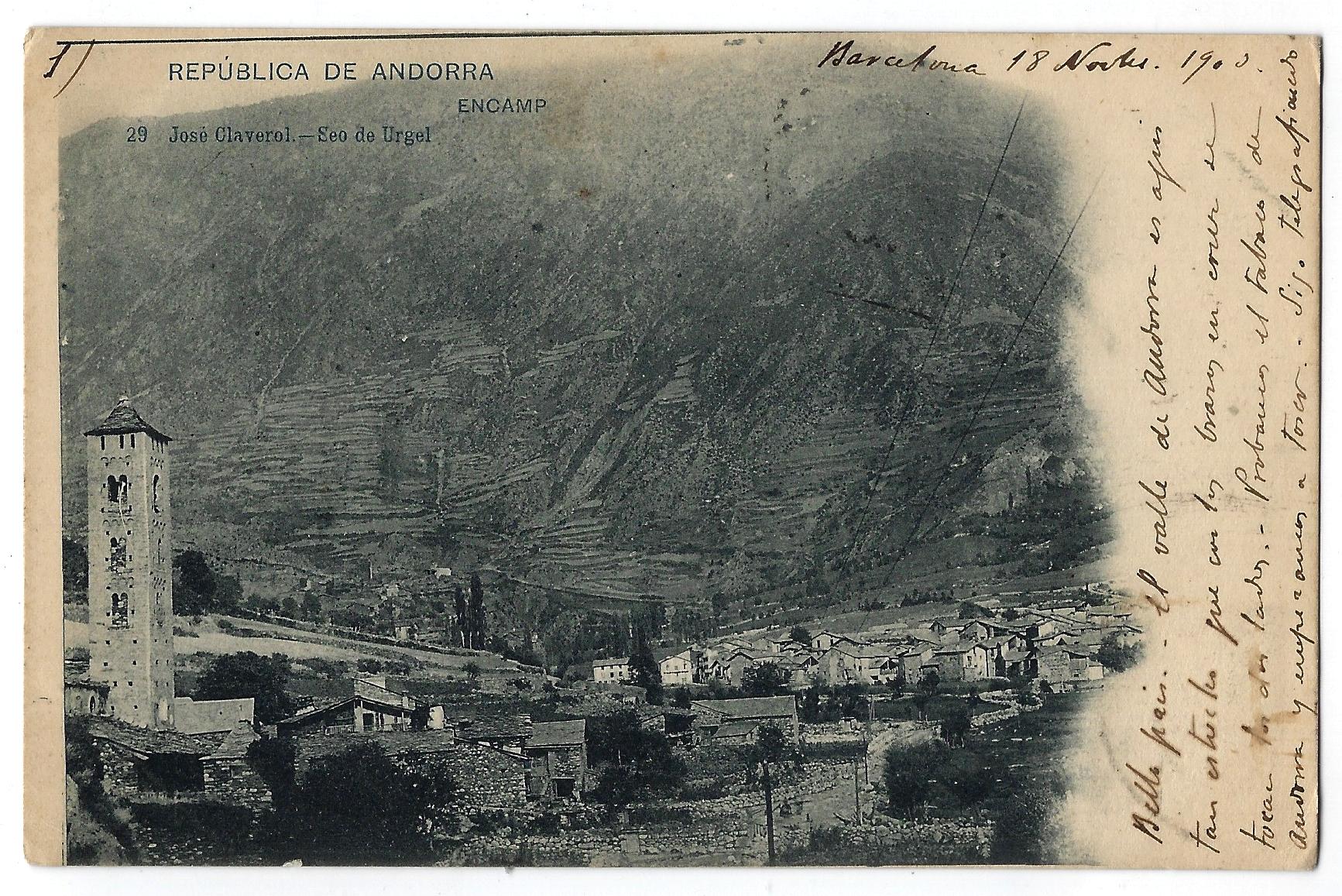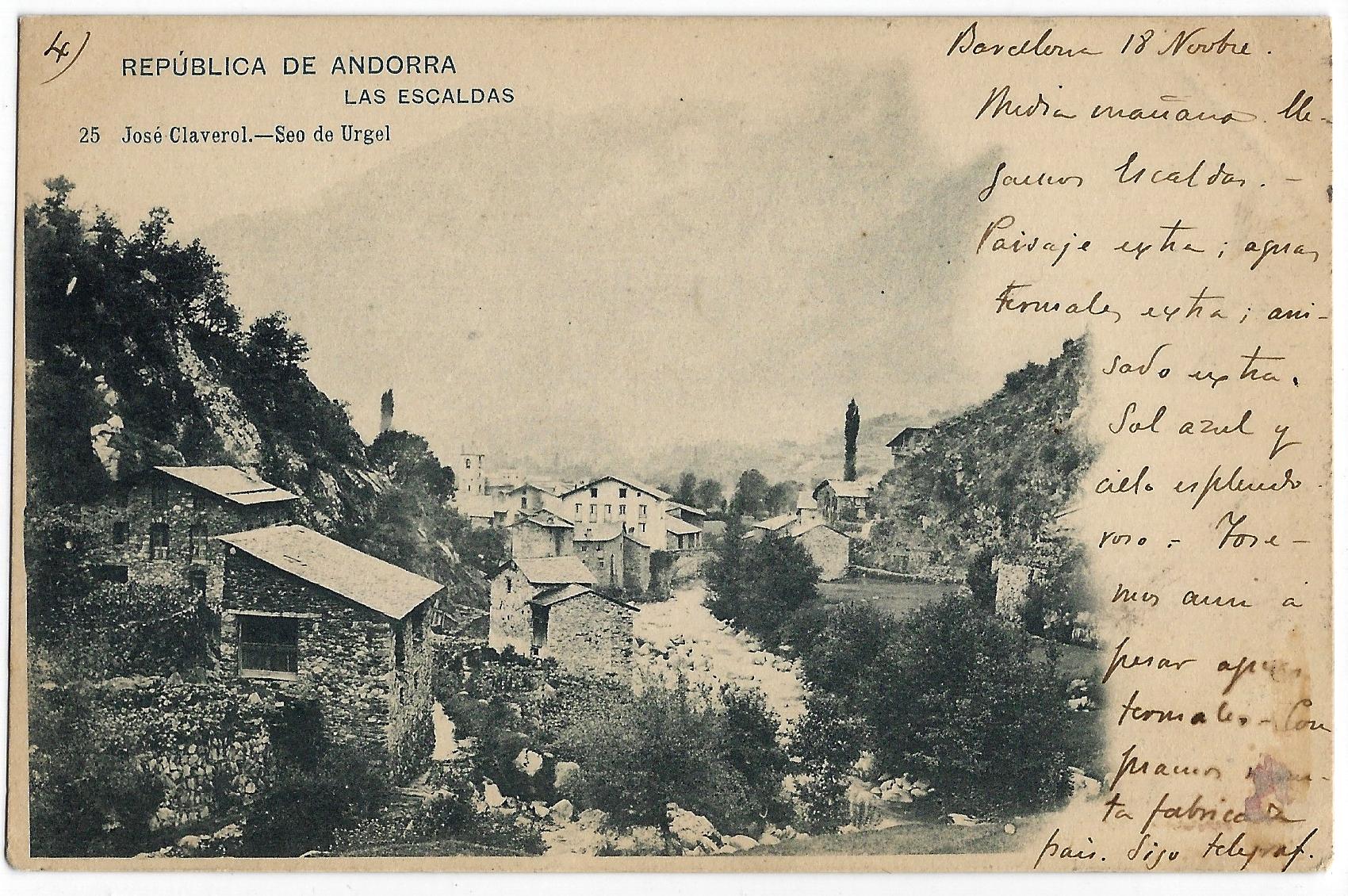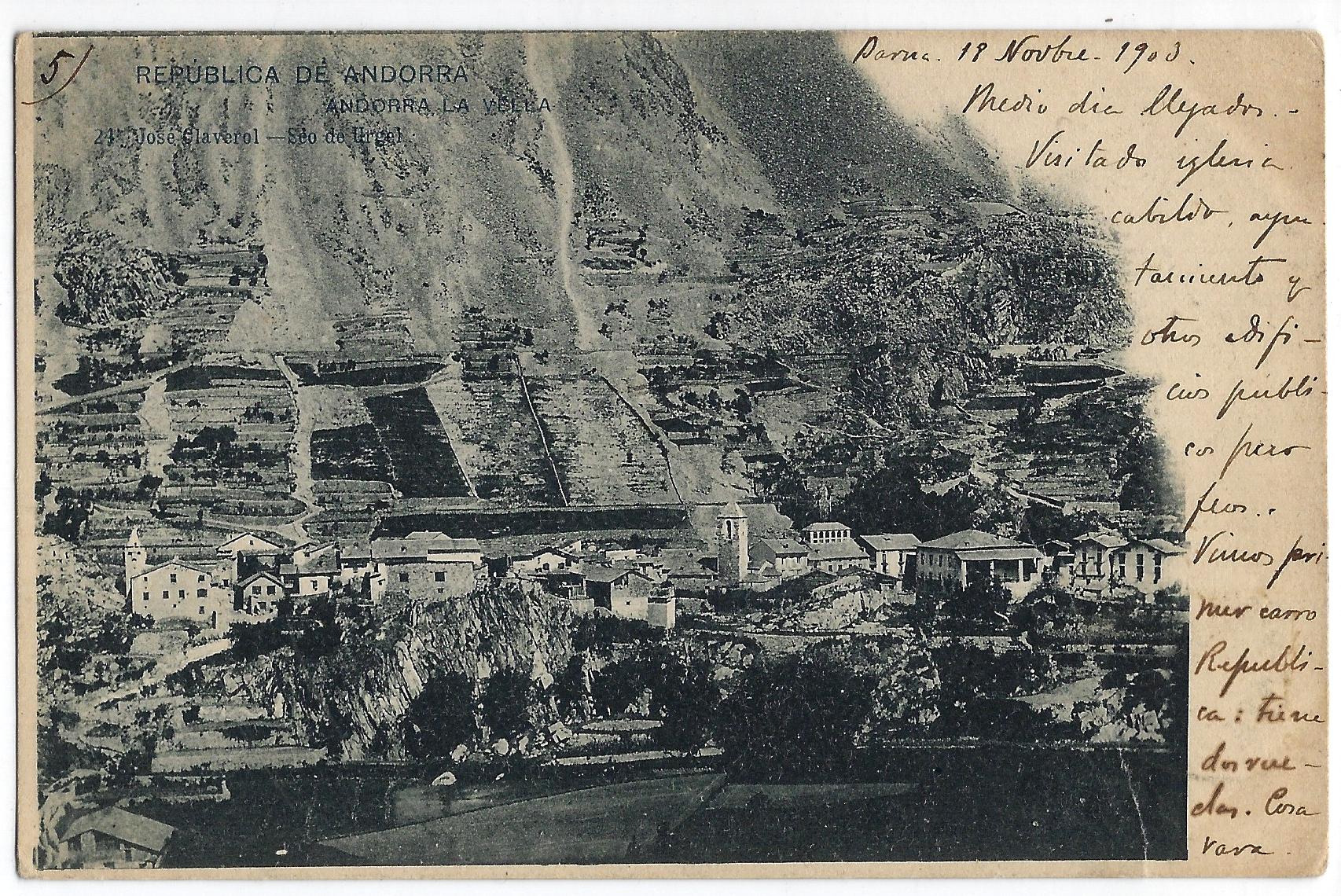 “Bello país. El Vall de Andorra es aquí tan estrecho que [con] los brazos en cruz se tocan los dos lados. Probamos el tabaco de Andorra y empezamos a toser. Sigo telegrafiando”. Així resa la primera i sensacional postal de la formidable sèrie d’onze targetes amb fotografies de José Claverol i editades per la casa Hauser y Menet de Madrid datades entre el 18 i el 19 de novembre del 1903 a Barcelona i que un tal G. Arés (o potser G. Aris) li va escriure puntualment a una amiga seva de la qual només sabem (de moment) que residia al Passeig de Gràcia de la capital catalana i que tenia la dèria de col·leccionar postals. El lot sencer va anar a parar per una d’aquelles casualitats del destí a mans de José María Sandoval, que també exerceix com a col·leccionista i de qui vam parlar aquí mateix fa uns mesos perquè entre els seus fons oceànics (entre 25.000 i 30.000 exemplars de temàtica eclèctica però tots datats entre finals del XIX i principis del XX) havia aparegut el negatiu original, una placa de vidre de 9 per 12 centímetres, del garrot vil de Casa de la Vall disparat a principis de segle per Guillem de Plandolit: és la fotografia més antiga que se’n coneix.