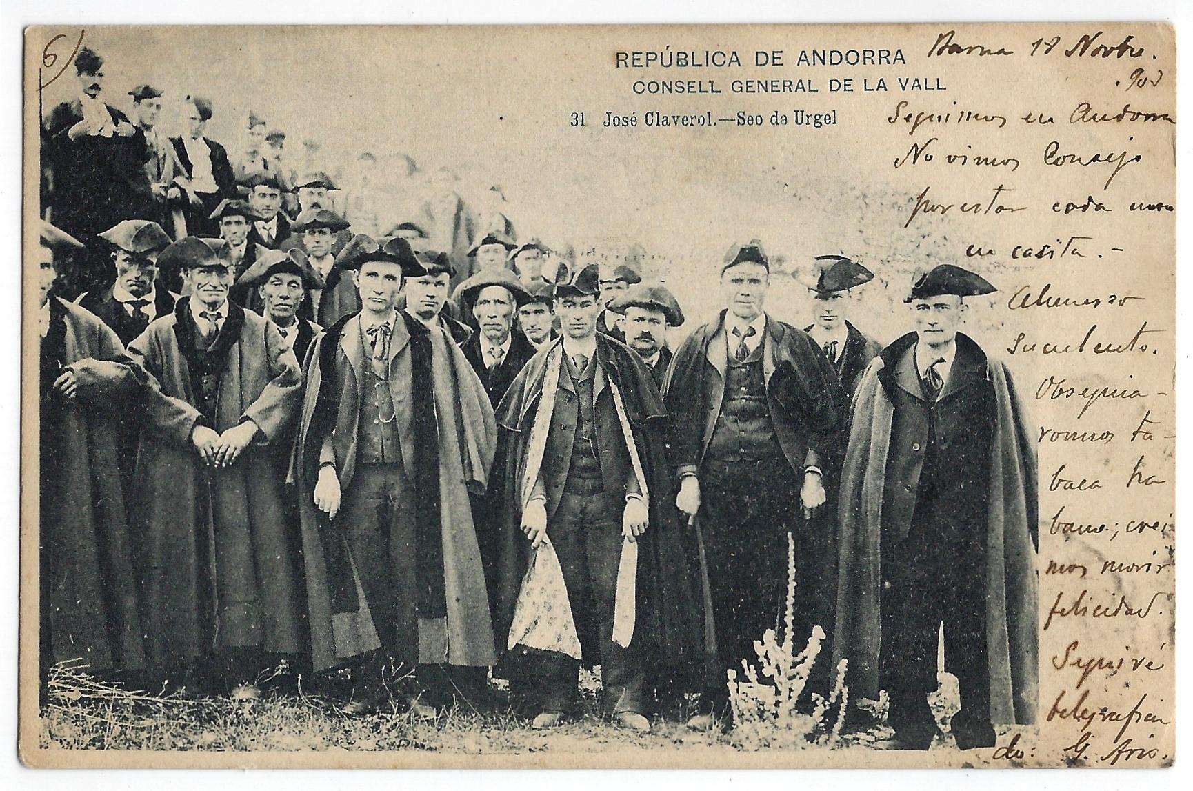Són onze postals, dèiem, totes del fundador de la nissaga dels Claverol fotògrafs, totes datades a Barcelona el novembre del 1903 i totes amb la mateixa destinatària. S’intueix que l’autor les havia adquirit durant un recent tour andosí i que es va esperar a ser de nou a casa, lluny de les exòtiques terres pirinenques, per escriure’n un particularíssim rapport i enviar-lo a la seva interlocutora. Entre les targetes hi ha la celebèrrima fotografia dels consellers generals abillats amb la capa i el gambeto reglamentaris, la primera que els Molt Il·lustres Senyors van permetre que els fessin. Data del 1902, l’any abans que el nostre G. Arés es plantés entre nosaltres, així que acabava com qui diu de sortir del forn. Hi ha també vistes d’Encamp, Ordino, Engolasters, Escaldes, la capital, la Massana, Canillo, Sant Julià, Santa Coloma i la duana de la Farga de Moles, però més enllà del document gràfic si no inèdit, raríssimament vist, el que crida especialment l’atenció és l’estil catxondo de l’escrivà. L’hem pogut intuir a la conclusió sensacional de la primera entrega de la sèrie: “Probamos el tabaco de Andorra y empezamos a toser”.