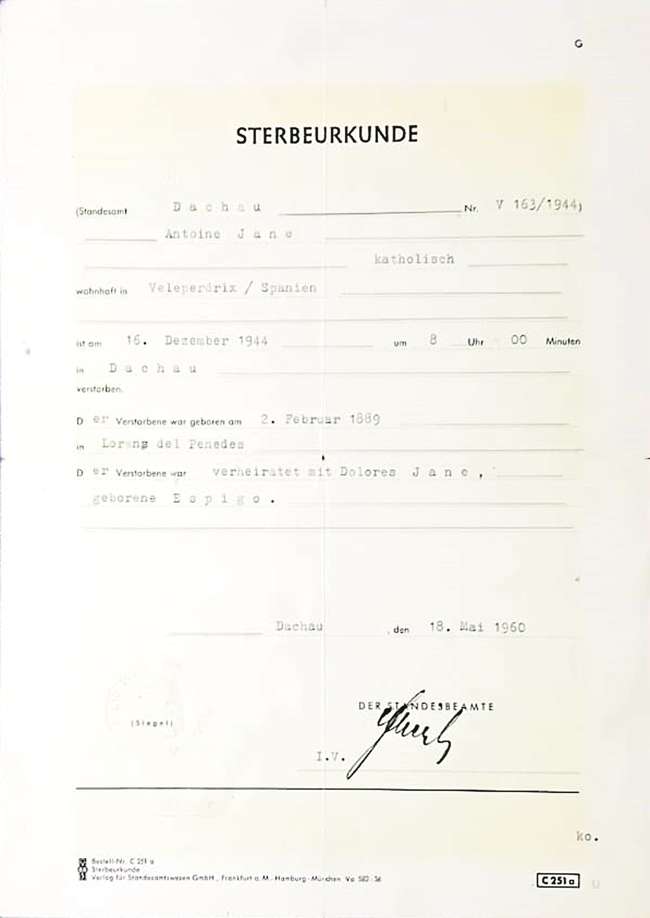 Hi ha històries tristes, com la que explica Ford Madox Ford a El buen soldado, i després ja la història d’Antoine Jané, que en realitat és la mateixa història, o una de molt similar, que la de desenes, potser centenars de deportats espanyols que van deixar la pell als camps de concentració nazi sense deixar rastre. O gairebé. Antoni Jané sí que en va deixar un. El certificat de defunció expedit el 18 de maig del 1960 diu que va morir a les 8 del matí (!) del 16 de desembre del 1944 a Dachau. Que havia nascut el 2 de febrer del 1889 a Llorenç del Penedès, tenia per tant 55 anys, que la seva última localitat de residència a Espanya va ser segons el document Veleperdrix, poble inexistent a la geografia espanyola o que com a mínim no hem sigut capaços de localitzar. I que s’havia casat amb Dolors Espigo (Espígol?).