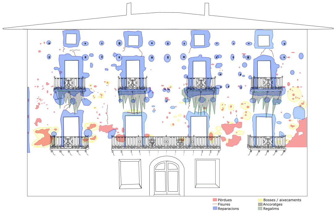 Un mapa. Aquesta és la fila que feia la façana de la casa Guillemó de la capital quan la van examinar els tècnics de Patrimoni i van determinar-ne l’estat (pèssim) de conservació de revestiment de calç i dels medallons decoratius, inclosos els falsos carreus de pedra de les cantonades i als laterals de les obertures que ja eren pràcticament invisibles. Aquí al costat en tenen la ubicació de les patologies que hi van constatar: entre pèrdues, fissures, reparacions, bosses, aixecaments i regalims el resultat era com la cara d’un boxejador després d’un combat. Un autèntic mapa. Però del boxejador l’havia perdut, és clar. Així que davant del risc “elevat” que se’n perdés definitivament el poc que en quedava el ministeri va auspiciar un conveni a tres bandes amb el Comú i la propietat per “recuperar” la façana.