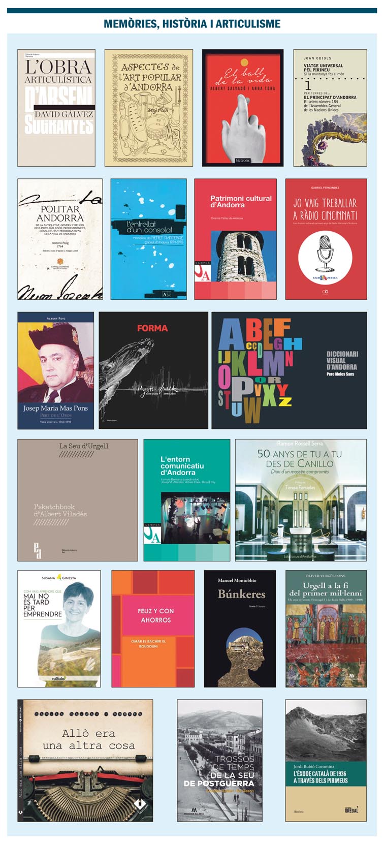 L’onada memorialista ha sigut, en fi, tan forta, que fins i tot Gabriel Fernández s’ha posat de nou al teclat per explicar (a la seva manera) els primers anys de Radio Nacional d’Andorra, que acaben de la manera més honrosa que pot esperar un periodista: al carrer per impertinent. Es titula, perquè no ho hem dit, Jo vaig treballar a Ràdio Cincinatti. En la mateixa línia, però en un altre món, per no dir un altre univers, Allò era una altra cosa, les memòries no de guerra, sinó de banca, de Carles Dalmau, quatre decennis llargs —des del 1945 fins al 1987— a l’oficina de Banesto a la Seu, i una pila d’anècdotes al sarró. I els Trossos de temps de la Seu de postguerra, on Sol Gasch i Amadeu Gallart passen comptes als anys foscos del primeríssim franquisme.