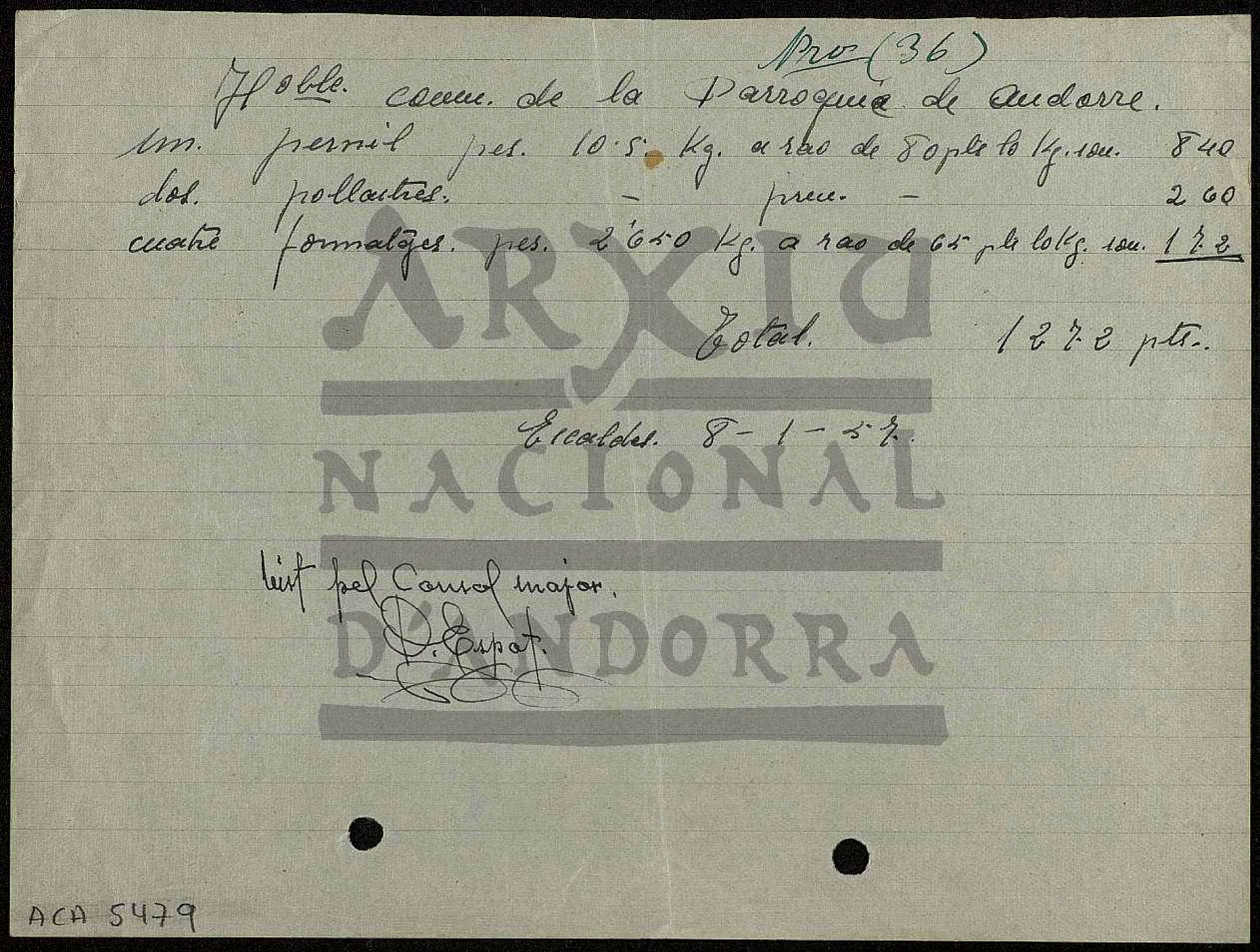 Es tracta de tirar la canya i esperar: piquen segur. Així, com qui no vol la cosa, es poden pescar per exemple els rebuts en concepte de pagament dels presents amb què la capital devia obsequiar el bisbe per Nadal. El desembre del 1955 el Comú va abonar a l’escaldenc Josep Baco 1.194 pessetes, desglossades així: “Per dos capons, 260; per un pernil, 713; per 4 formatges, 221”. Es veu que el pressupost per al present es mantenia més o menys estable, perquè un any després, el gener del 1958, el Comú hi va destinar 1.272 pessetes: “Un pernil, pes 10,5 Kg. a raó de 80 pts lo kg son 840; dos pollastres, preu, 260; cuatre formatges, pes 2’650 kg. a raó de 65 pts lo kg. son 172”.