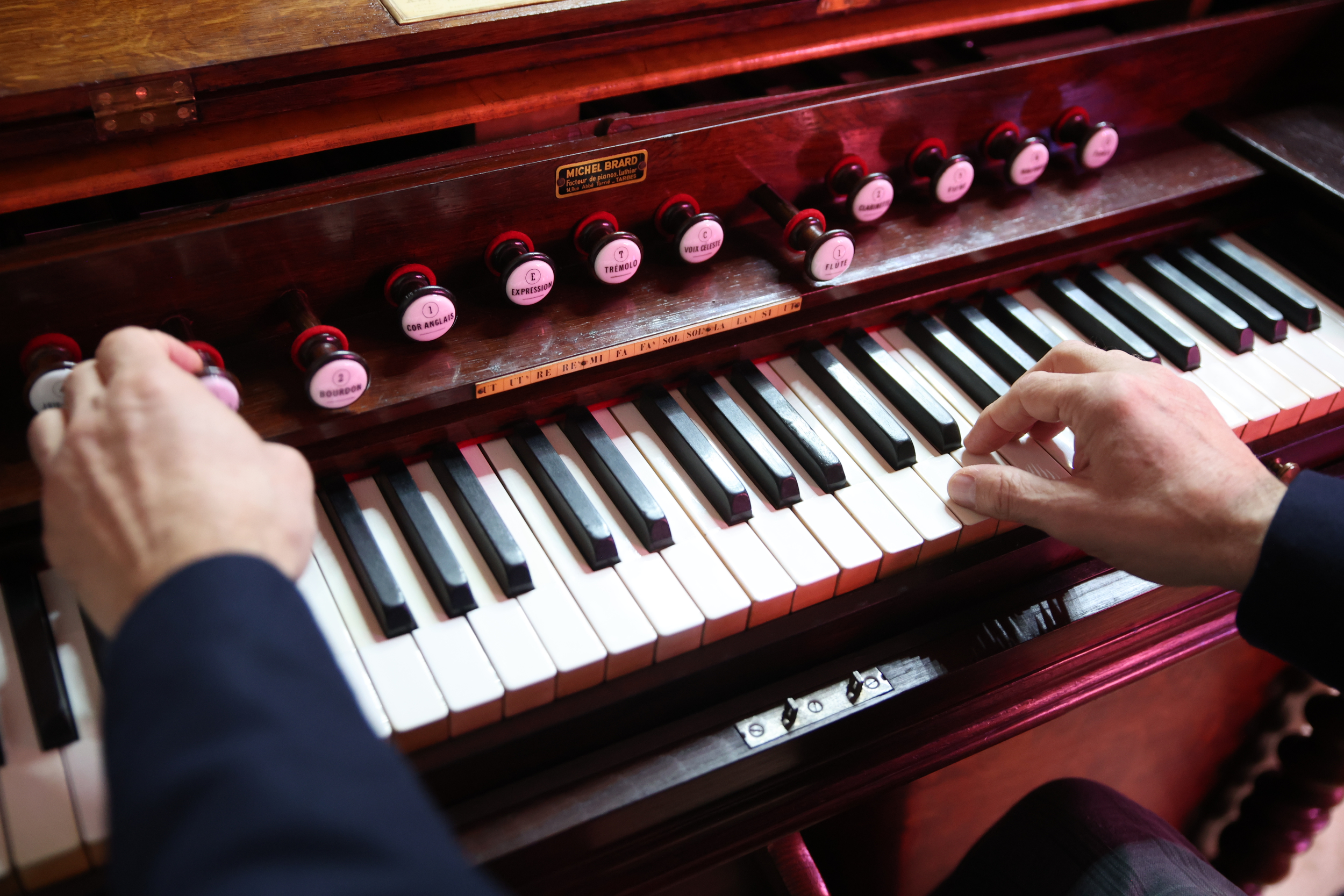 Ja no hi són. Ignorem on ha anat a espetegar el Crist Jacent. L'harmònium s'ha reubicat amb tots els honors al presbiteri del temple, en un lloc de privilegi on el mateix Ribas el toca a cada servei litúrgic. De fet, combina l'orgue amb l'harmònium, així que ara puja al cor i després baixa al presbiteri: ara que el té amb plenes facultats el que s'ha de fer és tocar-lo, diu. Música litúrgica sobretot, però no només litúrgica, perquè l'harmònium va ser fins a l'eclosió del Romanticisme i el triomf definitiu del piano un instrument molt estès, especialment entre les parròquies amb recursos justets. També era un instrument d'ús domèstic, i compositors com César Franck i, més cap aquí, Arthur Schönberg, n'estaven enamorats. Existeix, insisteix Ribas, un riquíssim repertori per a harmònium sol o per a harmònium i veu, piano i cordes que tocarà explotar en pròximes edicions del Festival d'orgue. I no serà difícil, perquè forma part dels estudis d'orgue i molts organistes en són també consumats intèrprets.