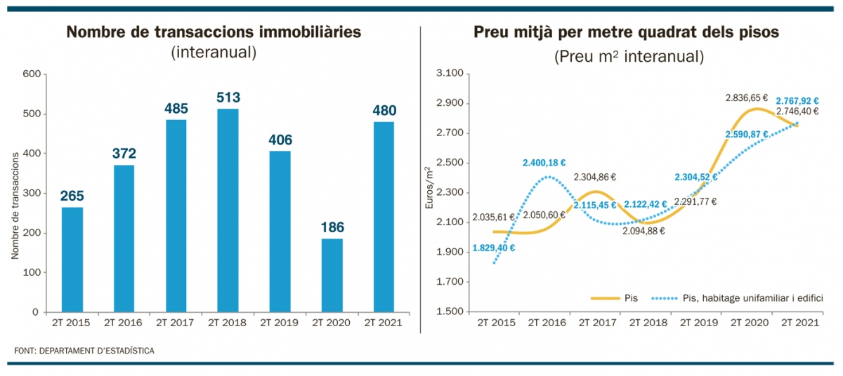 Aquesta situació es dona en un moment de creixement de les vendes d’habitatges. Durant el segon trimestre de l’any s’ha constatat un increment del nombre de transaccions immobiliàries del 158,1% respecte del mateix període del 2020, segons recull el departament d’Estadística. El total de vendes ha estat de 480, quan un any enrere van ser de 186. També s’ha viscut un augment del 38,2% en relació amb l’acumulat els darrers dotze mesos. Quant al nombre de béns immobles transmesos, han crescut un 139,3% respecte del segon trimestre del 2020, mentre que la variació anual de l’acumulat dels darrers dotze mesos ho fa un 35,1%.