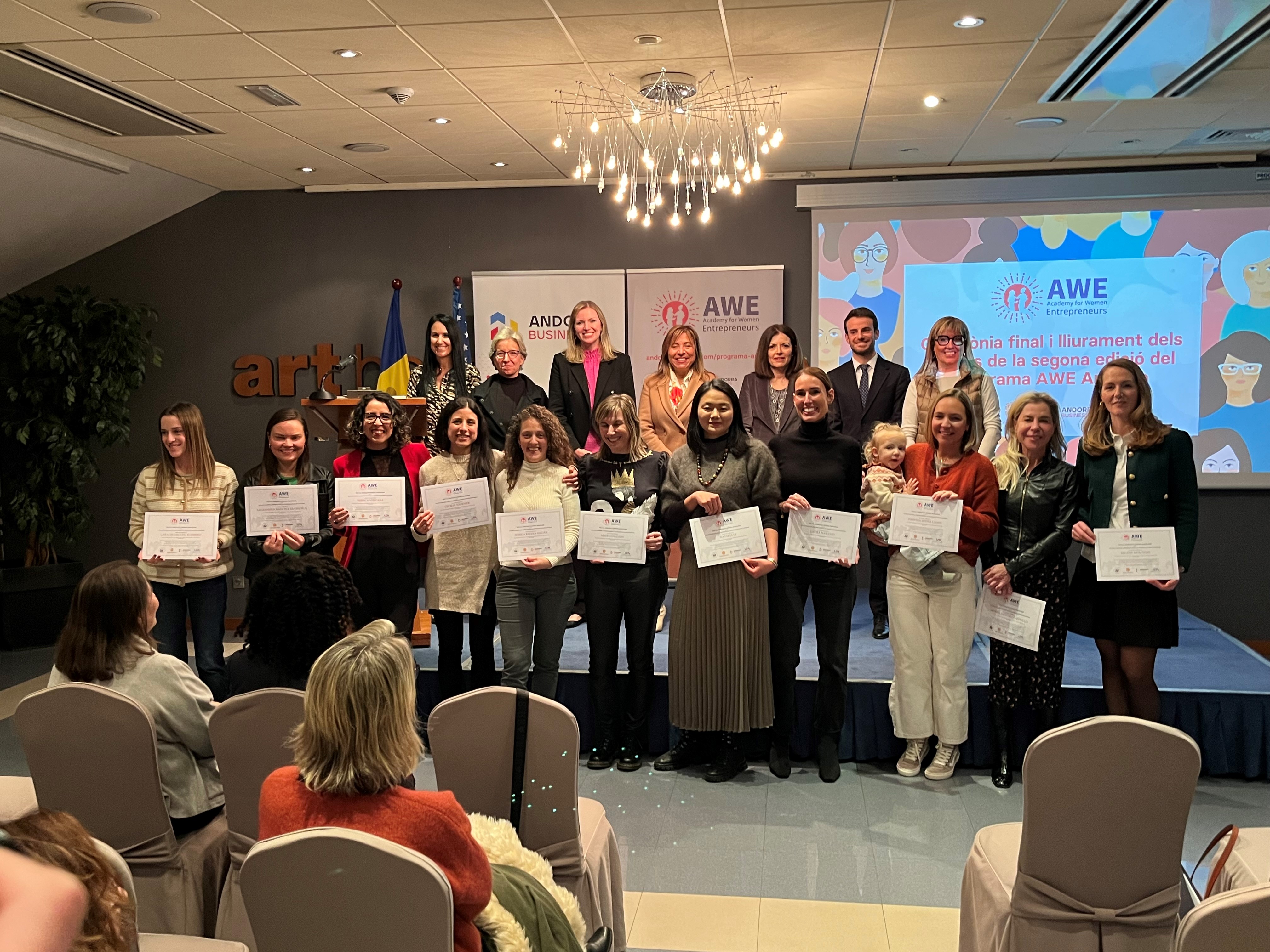 El Consolat General dels EUA a Barcelona en col·laboració amb Andorra Business han lliurat els premis als projectes més innovadors de la segona edició del programa gratuït de formació per a dones emprenedores del govern estatunidenc "Academy for Women Entrepreneurs" (AWE), que també ha comptat amb el suport de l’Associació de Dones d’Andorra. En aquesta edició han participat 14 emprenedores del país que tenen una startup creada en els darrers quatre anys o estan a punt de posar-la en marxa, i cinc han estat premiades.