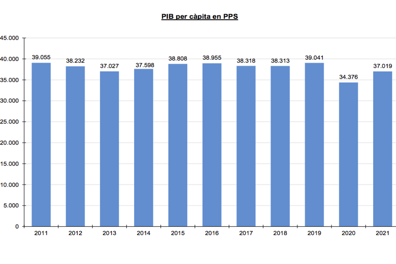 Quan es transforma el valor del PIB en termes de paritat de poder adquisitiu en euros, als efectes de comparar economies amb diferents nivells de preus, el PIB en PPS en euros se situa en un total de 2.944,3 milions d’euros, amb un variació del 9,8% respecte a l’any 2020. Si s’expressa aquesta magnitud en relació a la població, el PIB per càpita en PPS (euros) és de 37.019 euros,amb una taxa de variació del 7,7%.