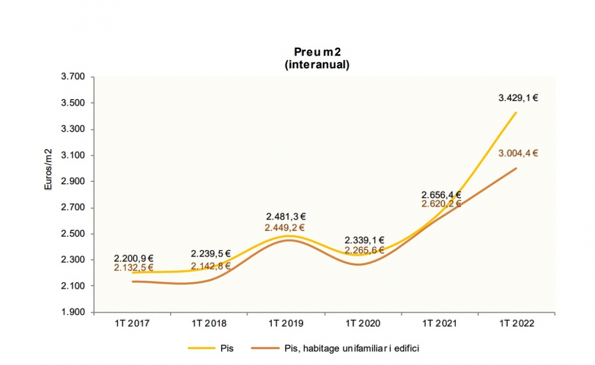 Així, pel que fa al preu mitjà per metre quadrat dels pisos s'ha situat en 3.429,1 euros, 772,6 euros més que el primer trimestre del 2021, el que suposa un increment del 29,1%. La dada es veu clarament disparada en relació amb els registres dels darrers any i de fet, cal remuntar-se al 2011 per trobar uns preus similars. En aquell moment, el preu mitjà per metre quadrat dels pisos era de 3.544,43 euros.