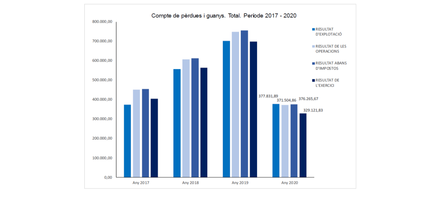 Quant a l'estructura del compte de pèrdues i guanys, es pot comprovar que l'any 2020 el resultat d'explotació va disminuir el 46,19% fins a arribar a 377,83 milions d'euros, a causa principalment de la forta caiguda del 12,81% que va experimentar el total dels ingressos d'explotació. També hi va contribuir l'augment de les amortitzacions (un 11,74% més respecte a l'any anterior). Tanmateix, aquesta partida va representar el 6,81% del total de les despeses d'explotació de l'any 2020, i va ser la partida amb menys pes dins de les despeses. Per contra, el consum de mercaderies, matèries primeres i altres materials, amb un pes del 50,97%, i les altres despeses d'explotació, amb un pes del 18,42%, van ser les partides més rellevants.
