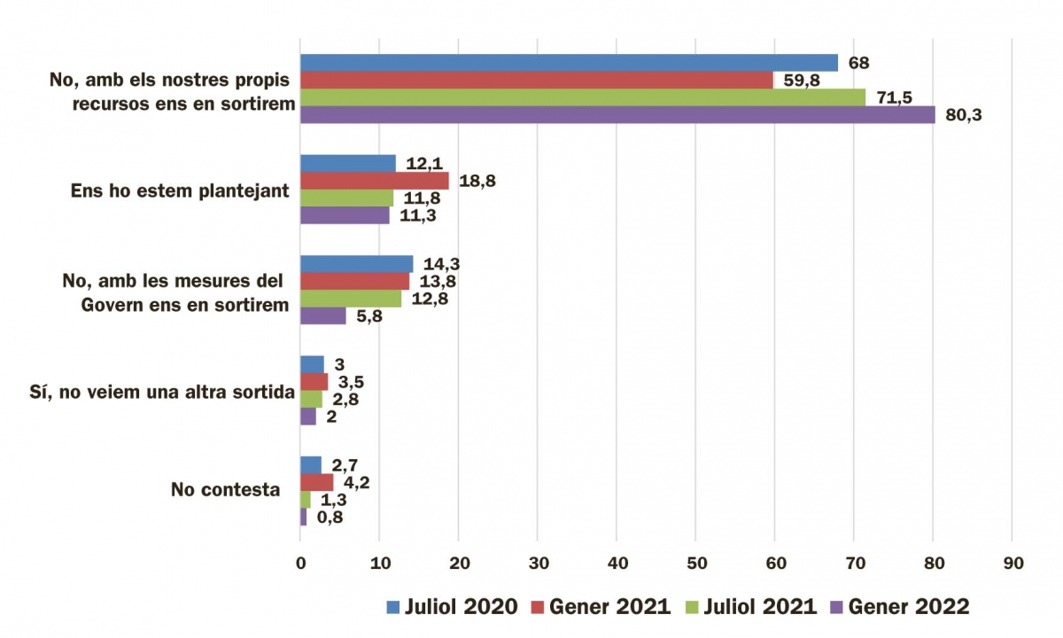 Durant el segon semestre del 2021 només el 6% de les empreses enquestades s’han acollit a alguna de les mesures d’ajuda atorgades pel Govern, molt per sota del 24,5% que ho havien fet el semestre anterior. Un 41,5% dels enquestats considera adequades les mesures per garantir la viabilitat econòmica dels negocis, un 15% no les veu suficients i un 11% diu que tot i que inicialment eren suficients, ara en caldrien altres. En global, les mesures reben una valoració d’un 3,19 sobre 5, la gestió de la crisi sanitària un 3,55 sobre 5 i la gestió de la crisi econòmica un 3,09. En tots tres casos les puntuacions empitjoren entre 1 i 3 dècimes.