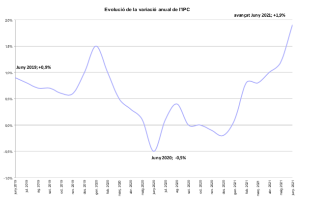 La variació interanual estimada de l’IPC al mes de juny és de l'1,9%, segons el càlcul de l’indicador avançat anunciat aquest dijous per Estadística. Aquest indicador representa un càlcul previ de l’IPC segons el qual, en cas de confirmar-se, augmentaria set dècimes respecte al mes de maig (1,2%).